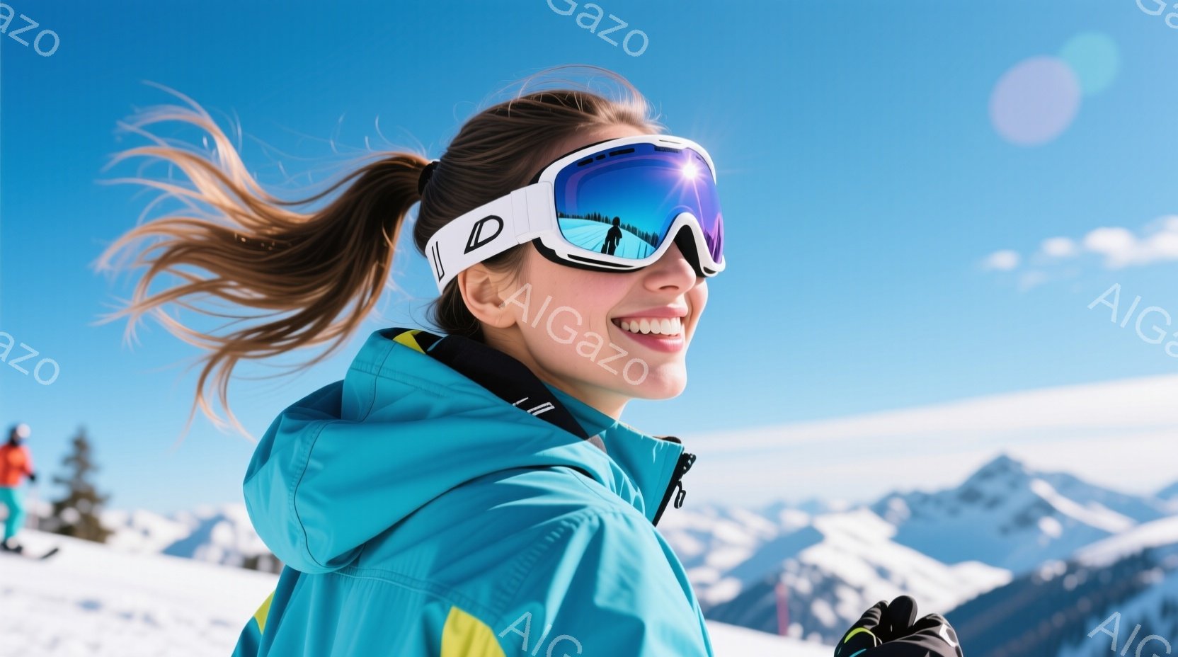 明るい青色のスキーウェアに身を包んだ女性が、雪山を背景に笑顔でこちらを見ている。髪は高い位置でポニーテールにしており、ゴーグルが顔の半分を覆っている。背景には雪景色が広がり、遠くには山々が見え、晴天で雪がちらついている。