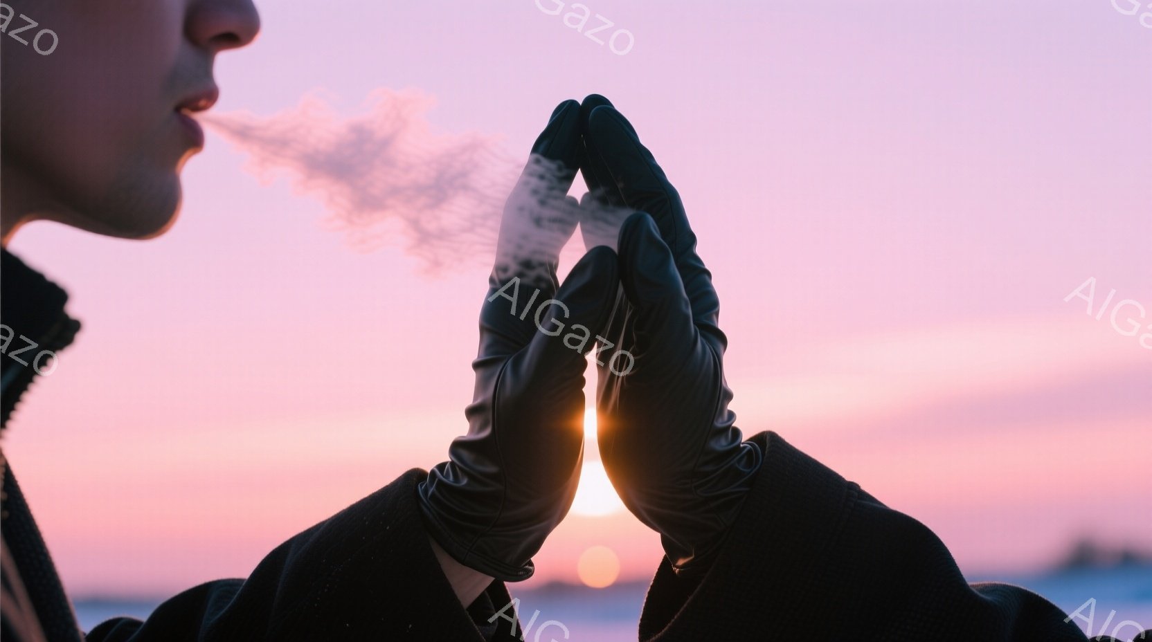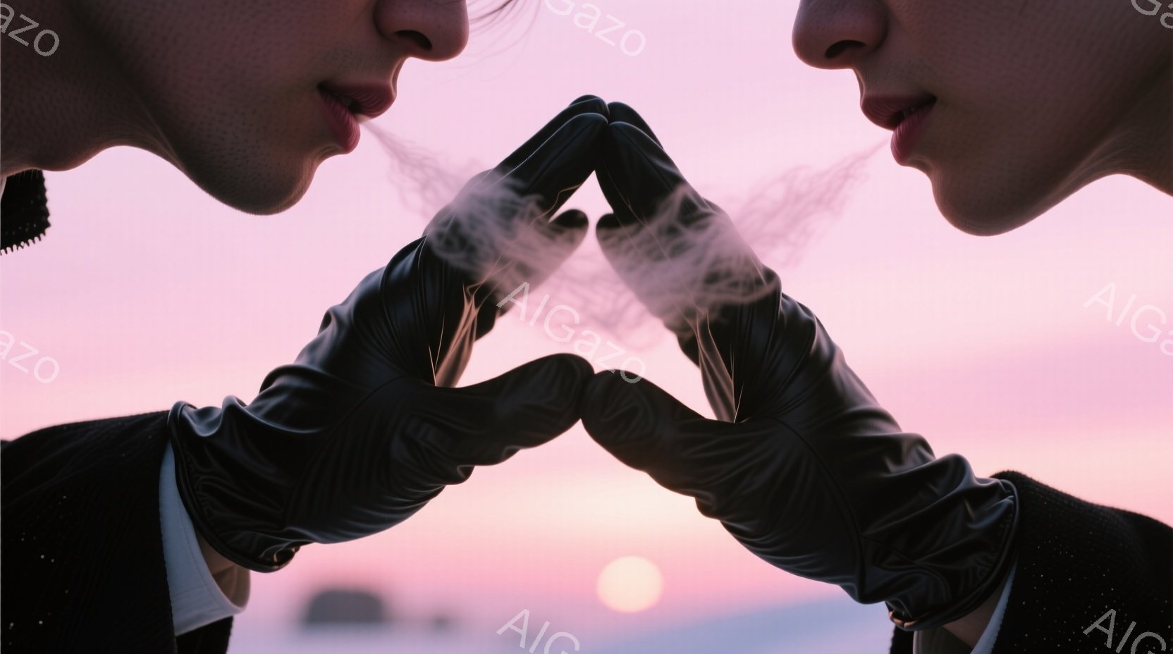 黒い手袋をはめた手が、空に向かってハートの形を作っています。背景は夕焼けのようなピンクとオレンジのグラデーションで、街並みがぼんやりと見え、温かく幻想的な雰囲気です。手からは白い煙のようなものが立ち上り、冷たい空気と暖かな光が混ざり合った様子が表現されています。