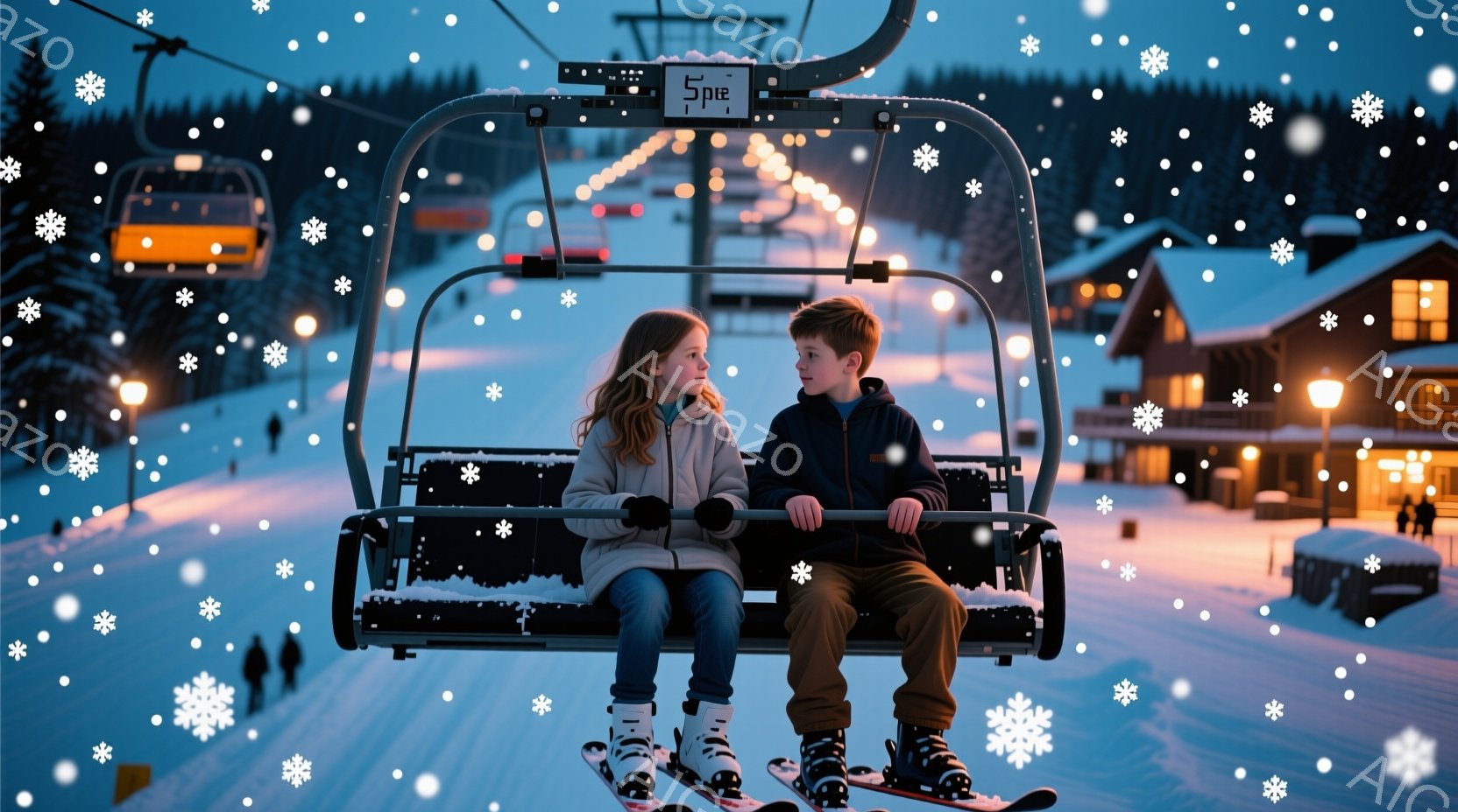 雪山を背景に、スキーリフトに乗った少年少女が描かれています。少女は明るいベージュのセーターを着ており、茶色の髪を後ろでまとめています。少年は濃い青色のジャケットを着ており、リフトの中で彼女の方を見ています。背景には、暖かく光る山小屋やスキー場施設が見え、雪がちらつく冬の風景が広がっています。
