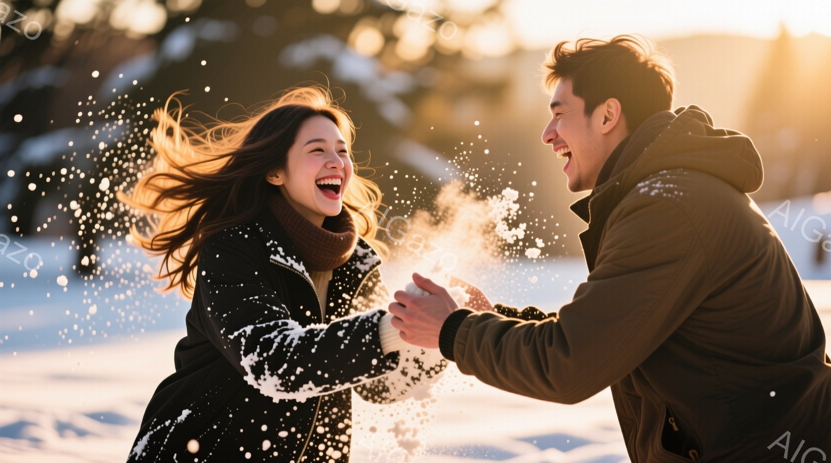雪景色の中、若い男女が雪合戦を楽しんでいる様子が写っている。女性は茶色のコートを着て、髪をなびかせながら満面の笑みを浮かべ、男性は黒いコートを着て、女性に雪を投げようとしている。背景には雪に覆われた平原と木々が広がり、夕暮れ時の暖かく優しい光が全体を包み込んでいる。