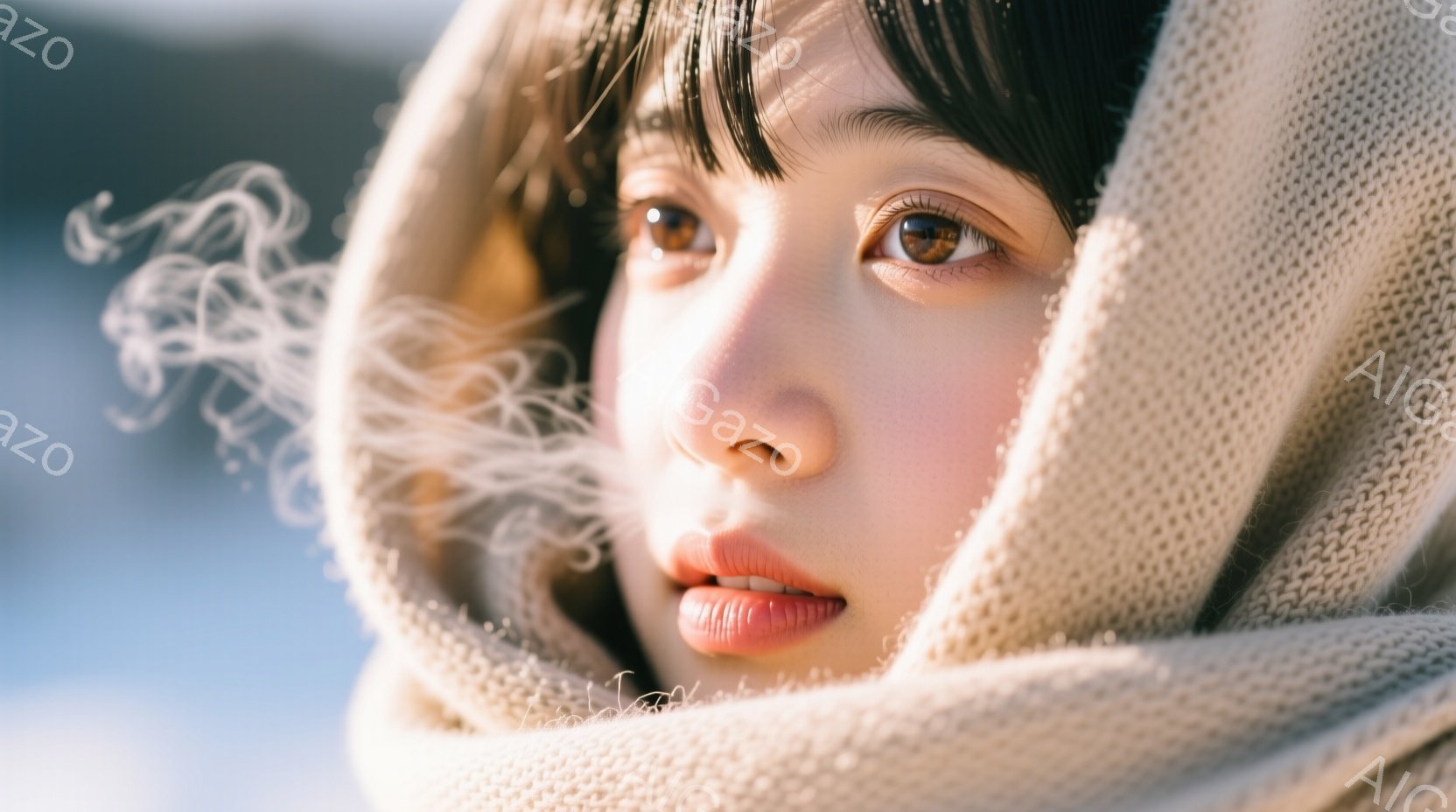 少女はオフホワイトのニット帽とマフラーを身につけ、寒さから身を守っています。彼女の黒髪は前髪が目にかかるようにカットされ、少し憂いを帯びた表情で遠くを見つめています。背景は淡い青空で、彼女の息が白い蒸気となって漂い、冬の冷たい空気を感じさせます。
