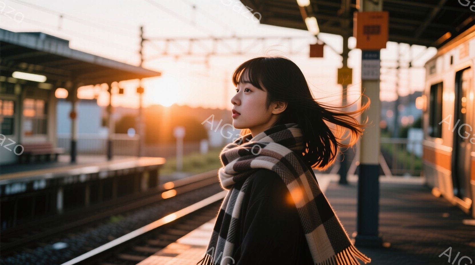 長い黒髪が風になびき、薄茶色のスカーフを巻いた若い女性が、線路のプラットフォームに立っている。彼女は何か遠くを見つめ、少し物憂げな表情を浮かべている。背景には、夕焼け空の下、田園風景が広がり、穏やかでノスタルジックな雰囲気を醸し出している。