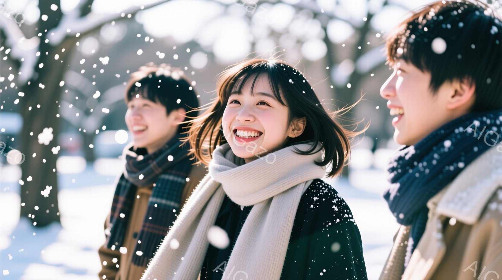 雪が舞う中で並んで歩く若い男女が写っています。女性は明るい笑顔で、肩までの黒髪に白いマフラーを巻いています。男性たちは黒いコートとマフラーを着用し、同じように笑顔を見せており、背景には雪に覆われた木々が見え、冬の暖かく幸せな雰囲気が漂っています。