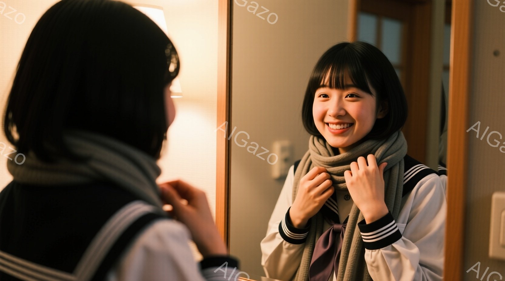 制服を着た若い女性が鏡の前でマフラーを巻いている様子が写っています。彼女は明るい笑顔で、少し上目遣いで自分の姿を見つめており、姿勢もリラックスしています。背景は控えめな室内で、壁の色や照明が暖かく、穏やかな雰囲気を醸し出しています。