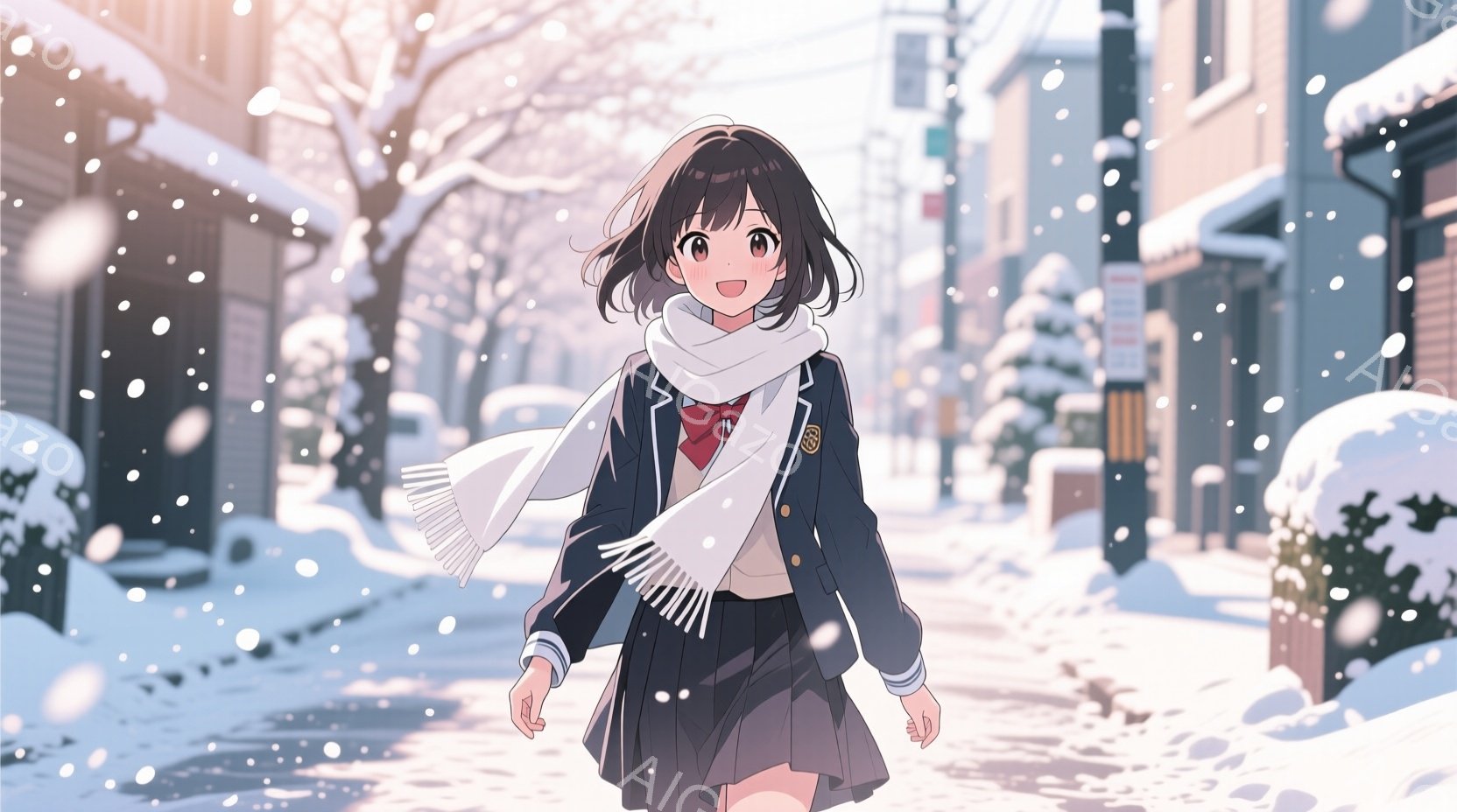 茶色の髪を肩まで伸ばした少女が、冬の雪景色の中を歩いている。紺色のリボンと白いセーター、チェックのスカート、そしてマフラーを身に着け、肩にかけたバッグを持っている。背景には雪で覆われた建物や木々が並び、雪が舞い降りる冬の穏やかな雰囲気が感じられる。