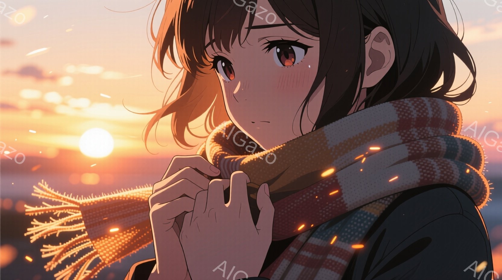 茶髪の少女がオレンジ色のマフラーを体に巻き付けています。彼女は少し恥ずかしそうな表情で、暖かさを求めているようです。背景には夜景が広がり、街の灯りと夕焼けが暖かく優しい雰囲気を醸し出しています。