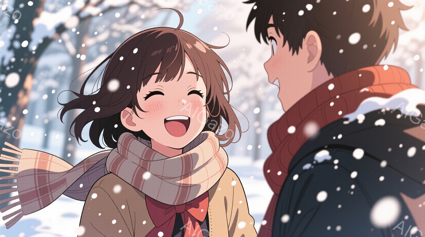 雪が降る中で笑顔を浮かべる男女が描かれています。女性は肩までの茶髪で、頬を赤らめながら楽しそうに笑っており、チェック柄の大きなマフラーを巻いています。男性は黒髪で、女性を見つめながら明るく微笑み、赤いマフラーを首に巻いています。
