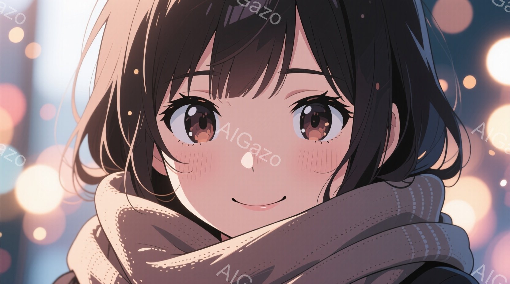 頬を赤らめた若い女性のアップです。彼女は茶色のカールした髪で、笑顔を見せ、首に白いスカーフを巻いています。背景はぼやけた黄色の光で構成されており、暖かく幻想的な雰囲気を醸し出しています。