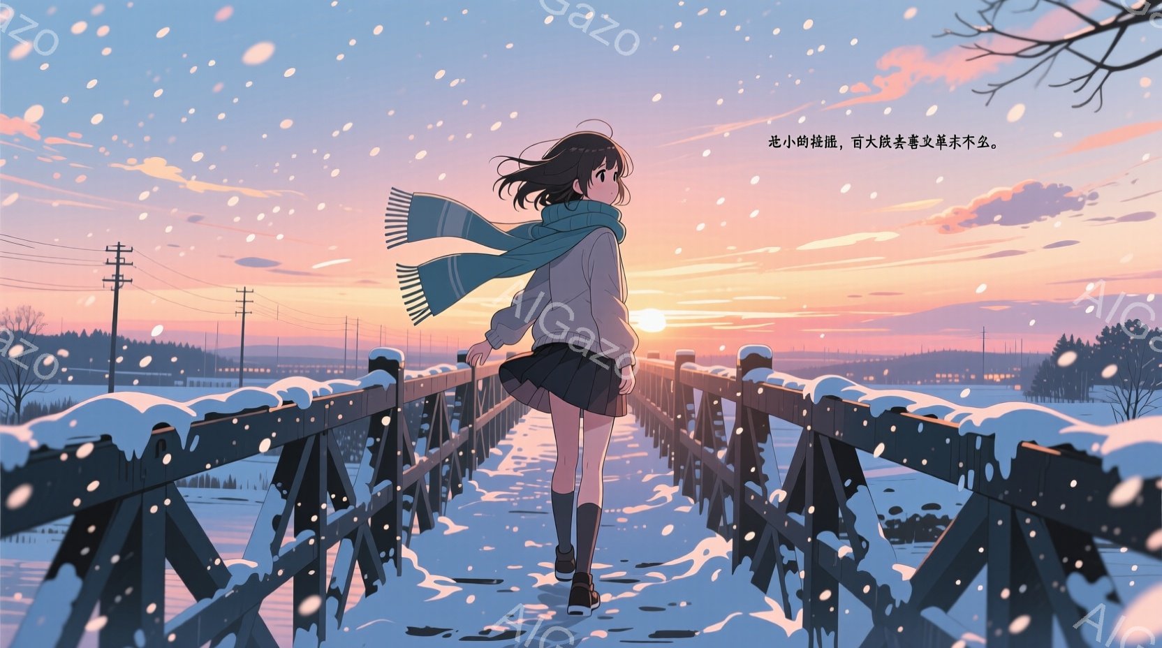 雪に覆われた橋の上を、少女が一人立っている。黒髪を肩まで伸ばし、白いセーターと黒いスカート、膝まである靴下を履き、首には淡いピンクのストールを巻いている。背景には雪景色が広がり、夕焼け空がオレンジとピンクに染まり、静かで物憂げな雰囲気を醸し出している。