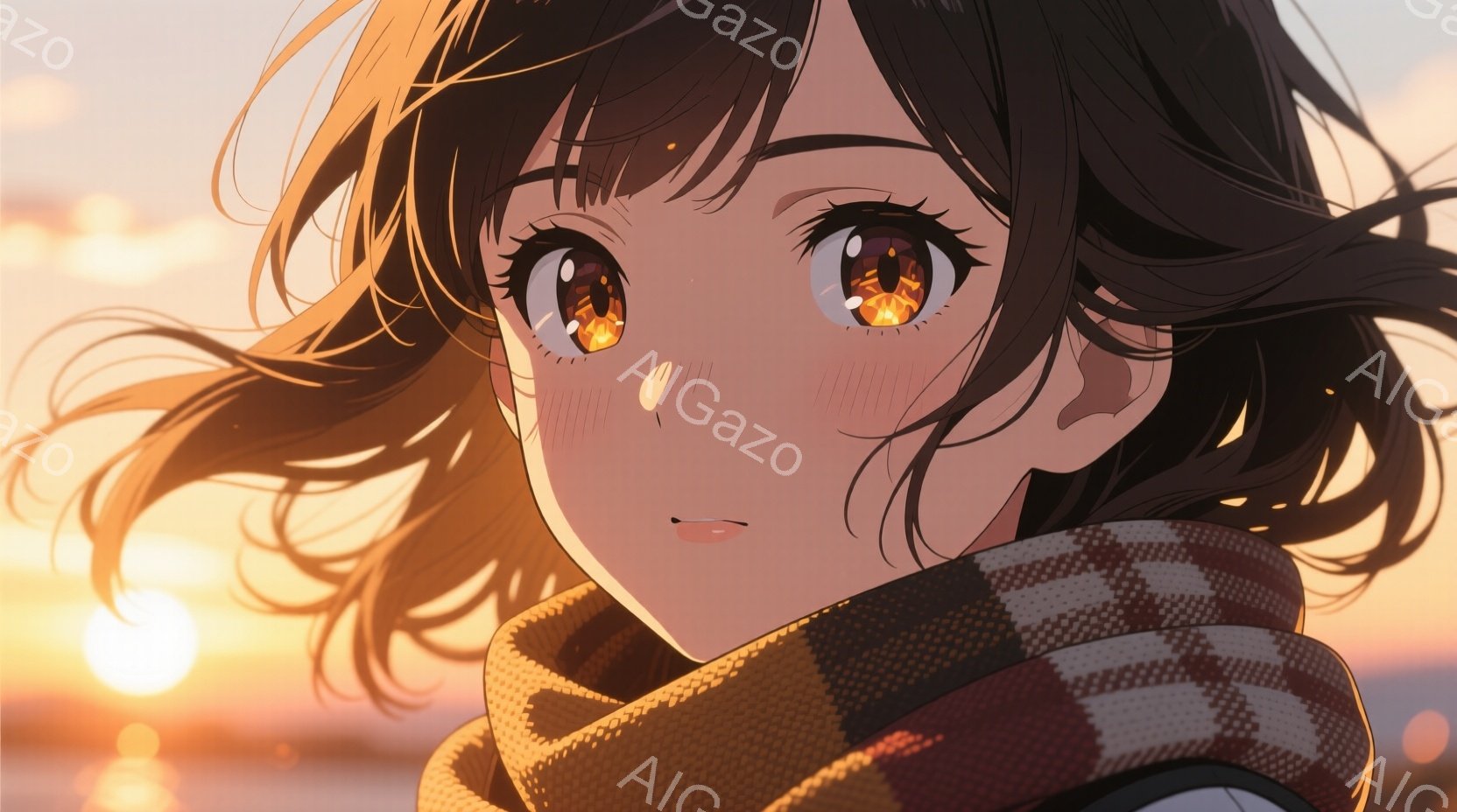 温かい色合いのストールを首に巻いた女性が描かれています。彼女は茶色のカールした髪を持ち、オレンジ色の瞳で微笑んでいます。背景には夕焼けの光が差し込み、暖かく穏やかな雰囲気を醸し出しています。