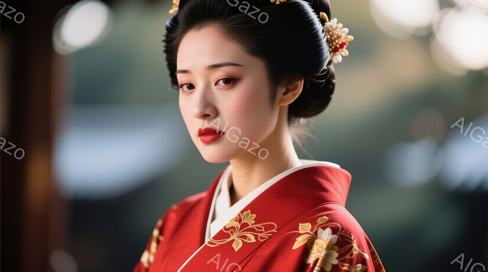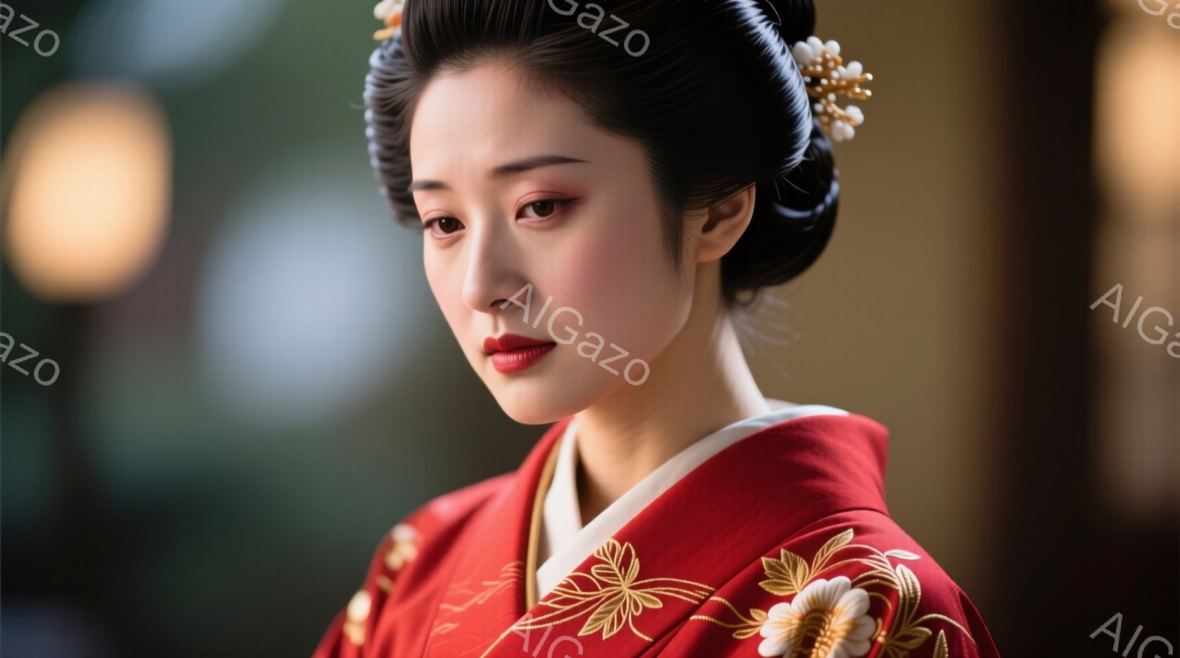 深紅色の豪華な衣装を身につけた女性が描かれています。黒髪は精巧にまとめられ、華やかな髪飾りをあしらっています。彼女は少し憂いを帯びた表情で、遠くを見つめており、全体的に優雅で神秘的な雰囲気を醸し出しています。