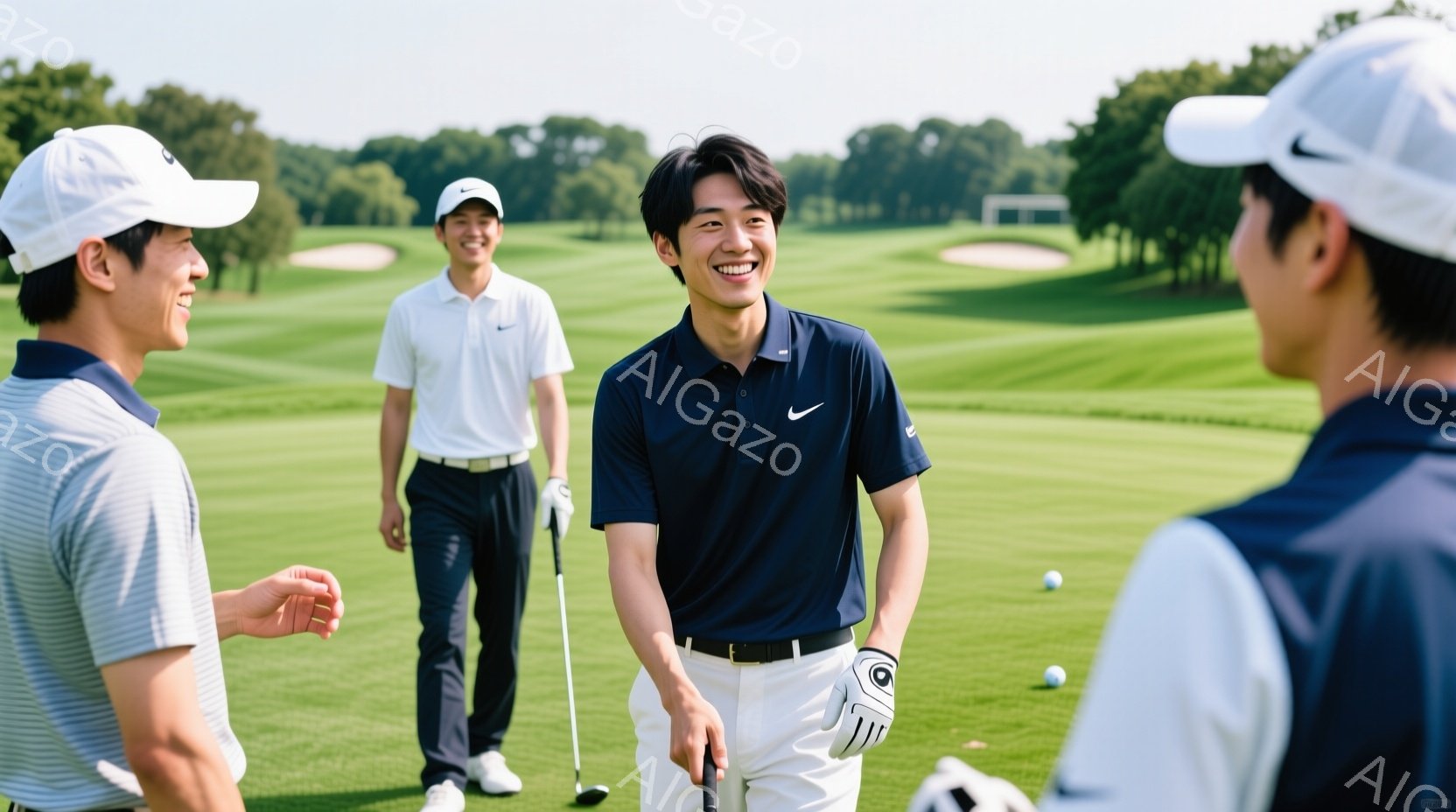 ゴルフコースでゴルフを楽しむ若い男性たちが写っています。彼らは皆、ポロシャツとショートパンツを着用し、白いスニーカーを履いており、明るい表情で楽しんでいる様子が伺えます。背景には緑豊かなゴルフコースが広がり、晴天の下でリラックスした雰囲気が漂っています。