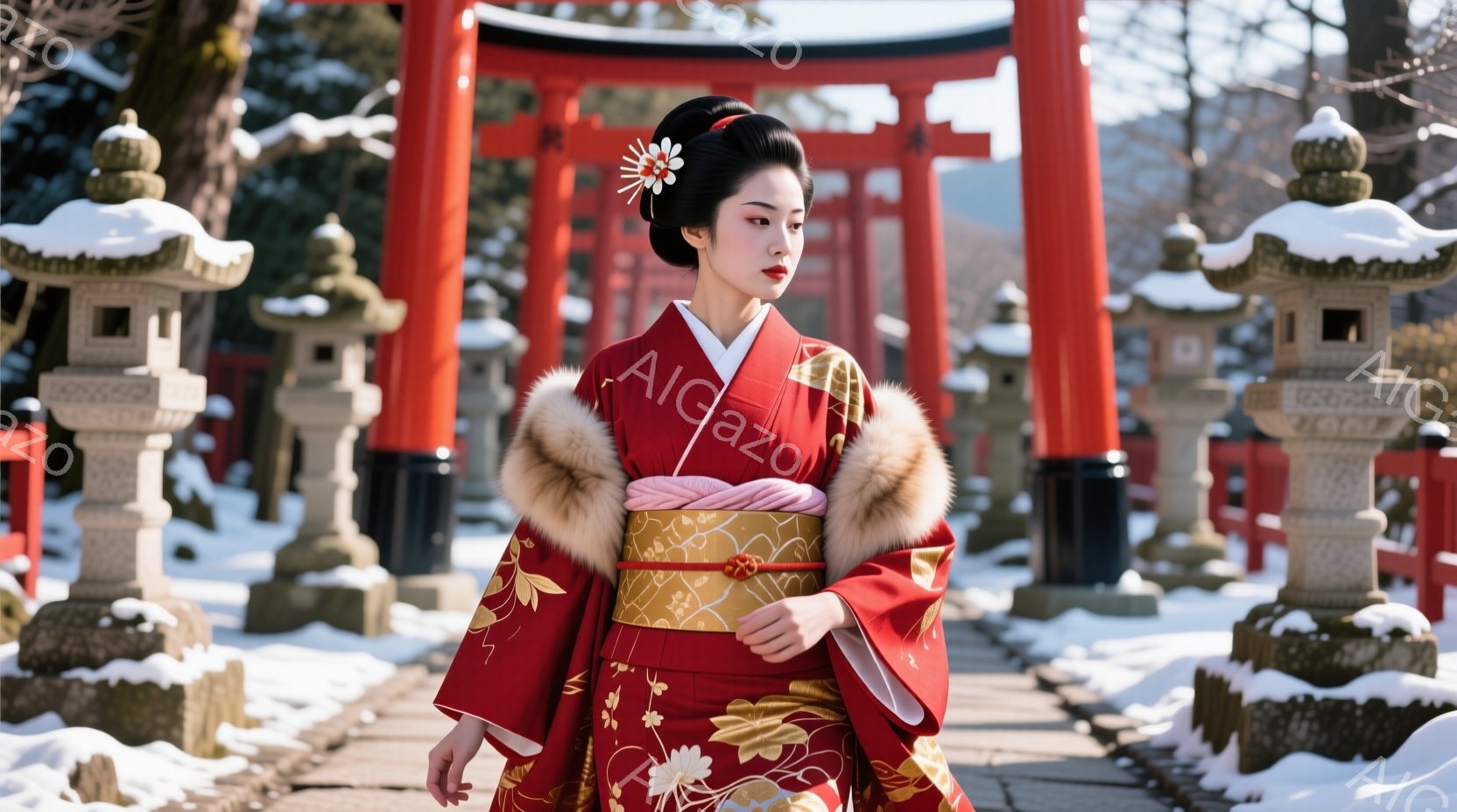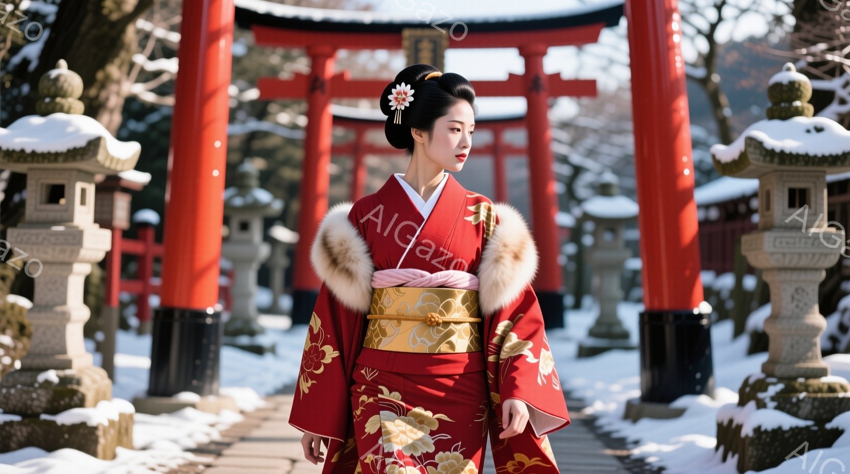 深紅色の豪華な着物を着た女性が、雪に覆われた参道を進んでいます。金色の刺繍と模様が施された着物には、白いファーの襟が付いており、髪は伝統的な日本髪にまとめられ、髪飾りをつけています。背景には朱色の鳥居が立ち並び、雪景色と相まって、厳かで美しい冬の雰囲気を醸し出しています。