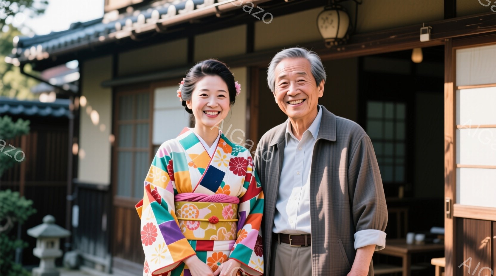 女性は鮮やかな色の花柄の着物を着ており、髪を後ろでまとめ、和風の髪飾りをつけています。男性は薄茶色のシャツに濃紺のジャケットを羽織り、穏やかな笑顔を浮かべています。二人は庭の前に立ち、背景には伝統的な日本の家屋が見え、穏やかで温かい雰囲気が漂っています。