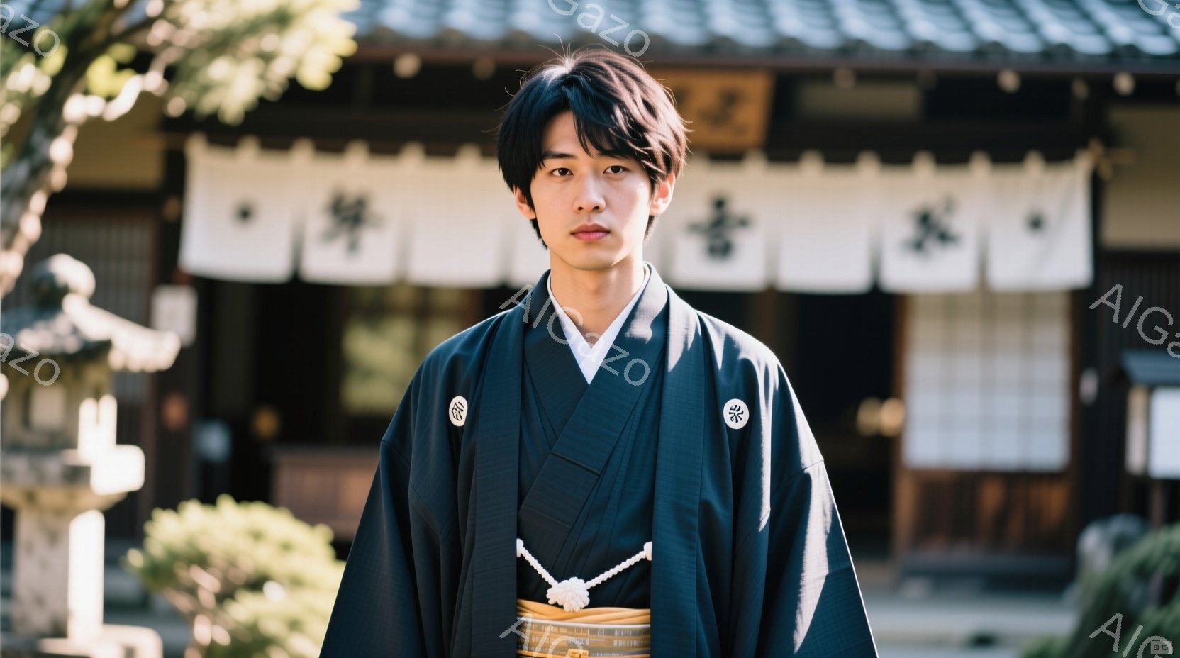 この無料AI生成画像「黒い着物と縞模様の袴を身に着けた男性が、神社の鳥居の前で深々と頭を下げています。彼は髪を短く整え、祈るように目を閉じています。背景には、石灯籠が並び、赤い鳥居が印象的な神社の一角が広がっており、穏やかな日差しが降り注いでいます。」は、2025年10月27日に作成されました。 サイズは 1664×928px の高解像度で、商用利用も可能なフリー素材として提供しています。