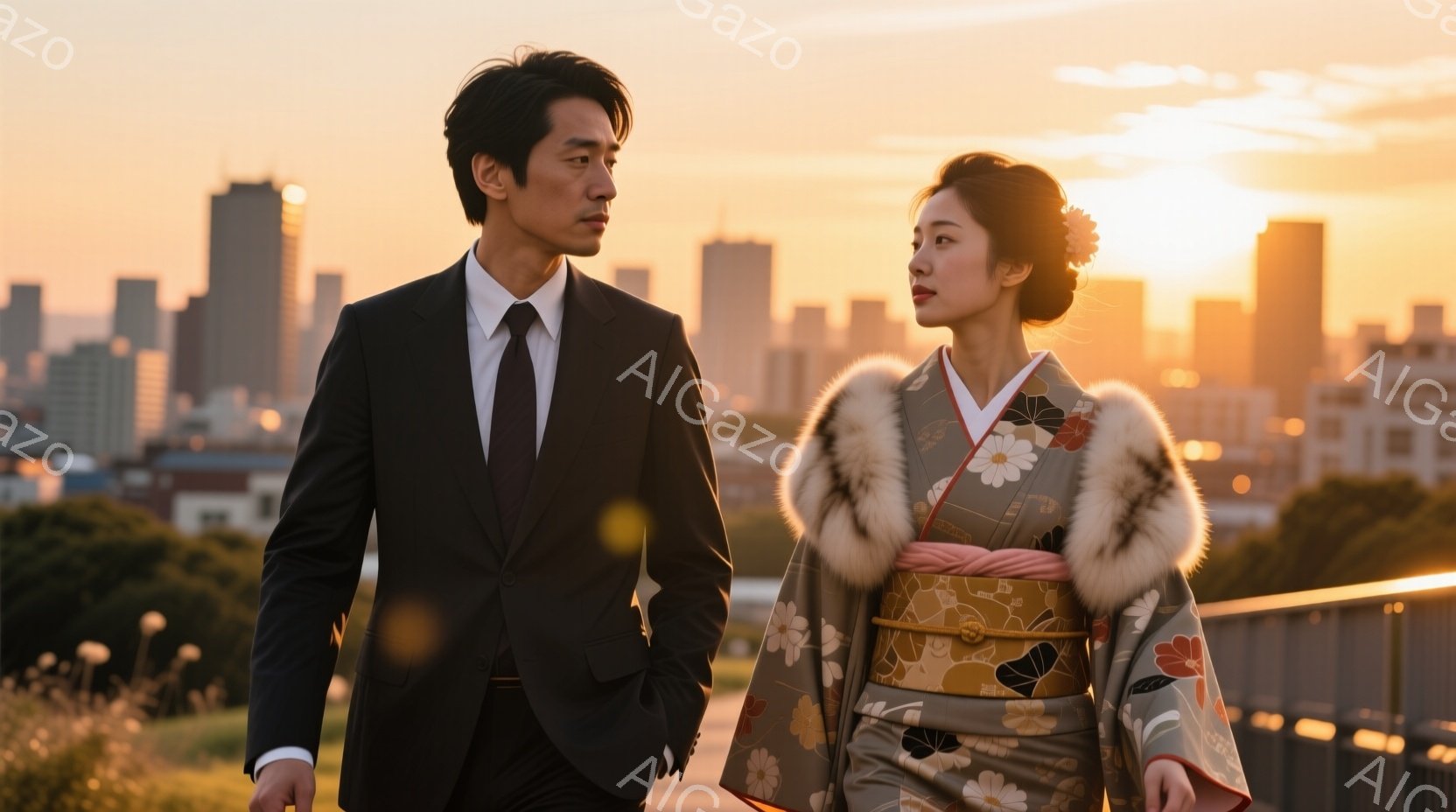 スーツを着た男性と、着物を着た女性が並んで歩いている。背景には夕焼けに照らされた都市のスカイラインが広がり、暖かくロマンチックな雰囲気を醸し出している。女性は華やかな着物に身を包み、髪を上品にまとめ、男性はシックなスーツ姿で、互いにわずかに顔を向け合っている。