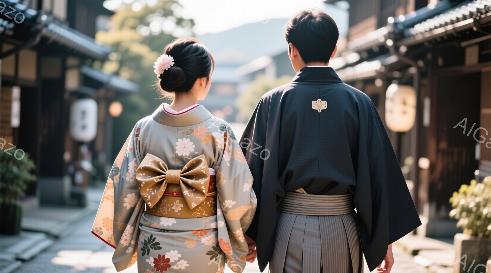 浅緑色の着物を着た女性と黒色の着物を着た男性が並んで歩いている。女性は髪を後ろでまとめ、かんざしをつけている。背景には伝統的な木造建築が並び、石畳の道と緑豊かな自然が広がっており、晴れた日の穏やかな雰囲気が漂っている。