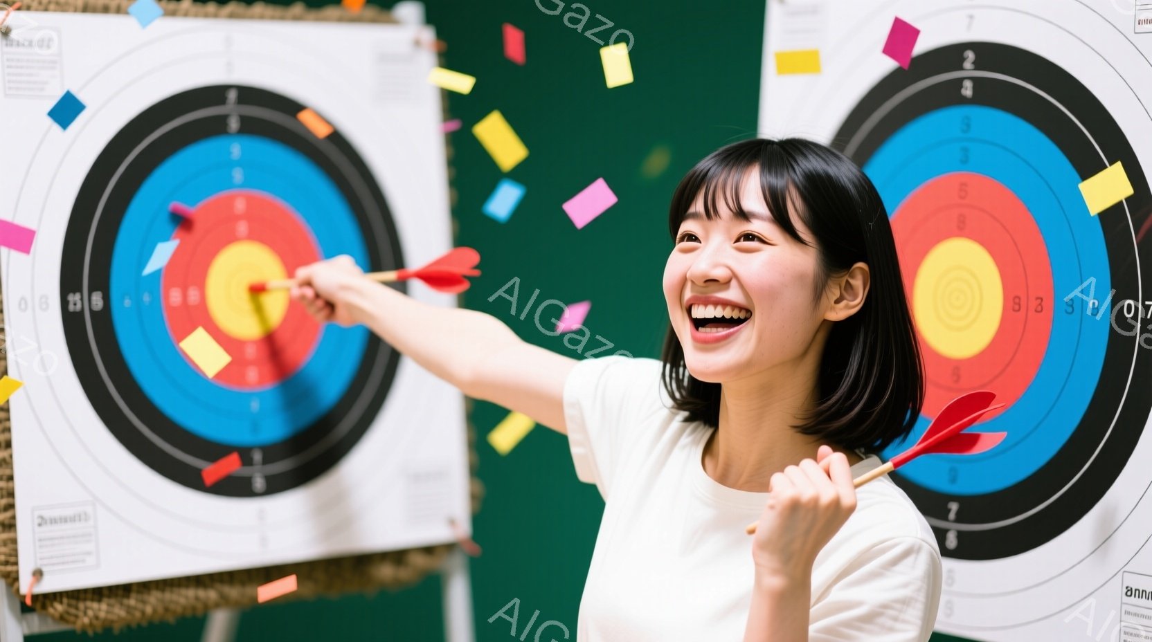 若い女性が弓矢で射撃をしている様子が写っています。彼女はセーラー服を着ており、髪を後ろで一つにまとめています。顔には喜びの表情が浮かび、矢が的の中心に命中した瞬間を捉えているようです。