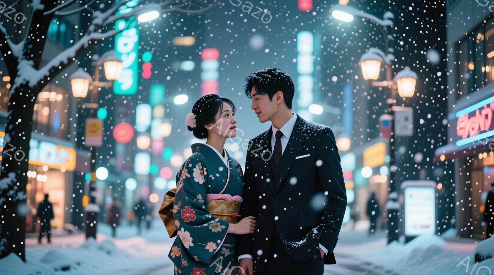 夜の街で、新郎新婦と思われる男女が寄り添い合っている。男性は黒いスーツと白いシャツで、女性はクリーム色の着物とファーのショールを身につけ、髪には花飾りをつけている。背景は雨に濡れた道路とぼやけたネオンライトで、全体的にロマンチックで少し物憂げな雰囲気が漂っている。
