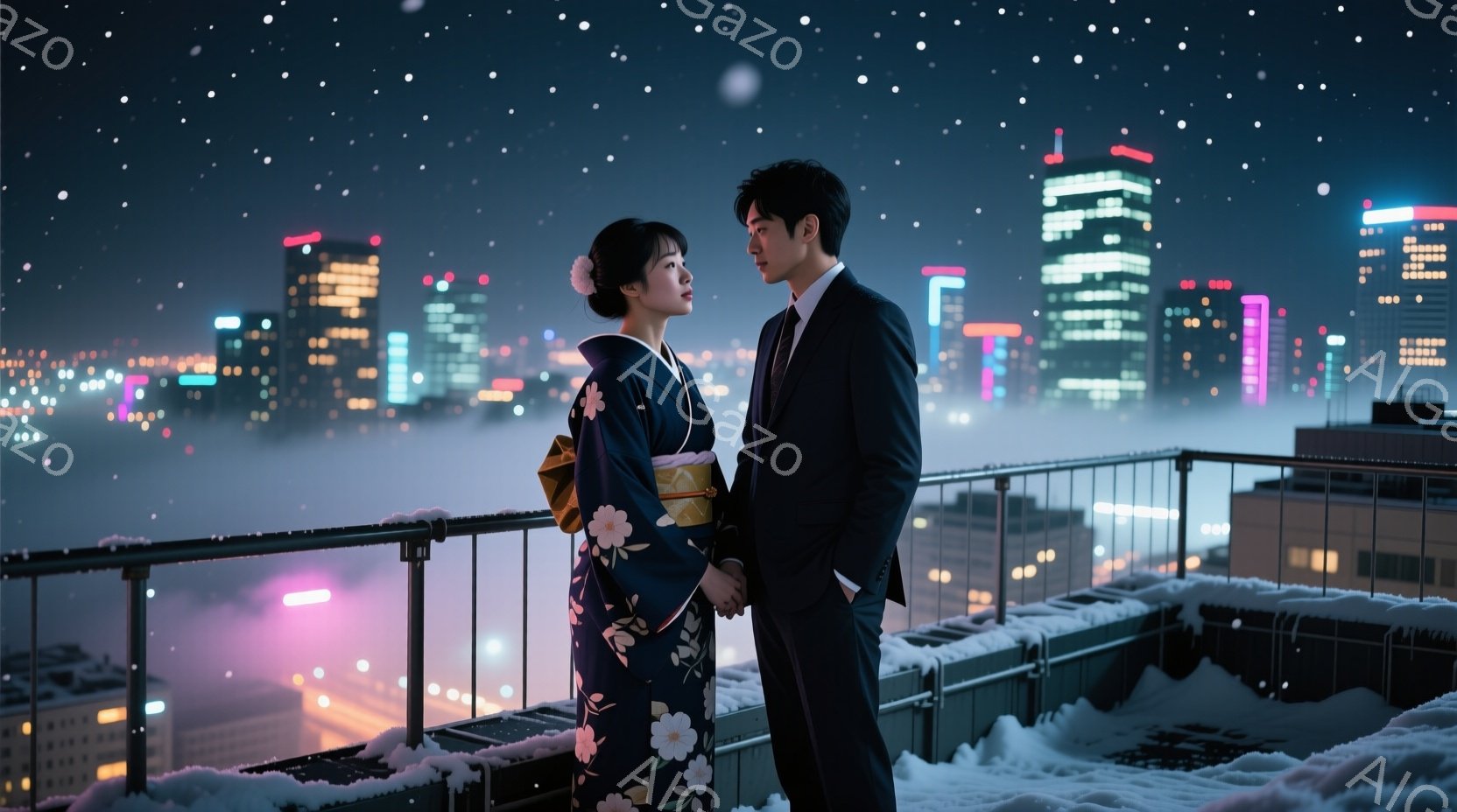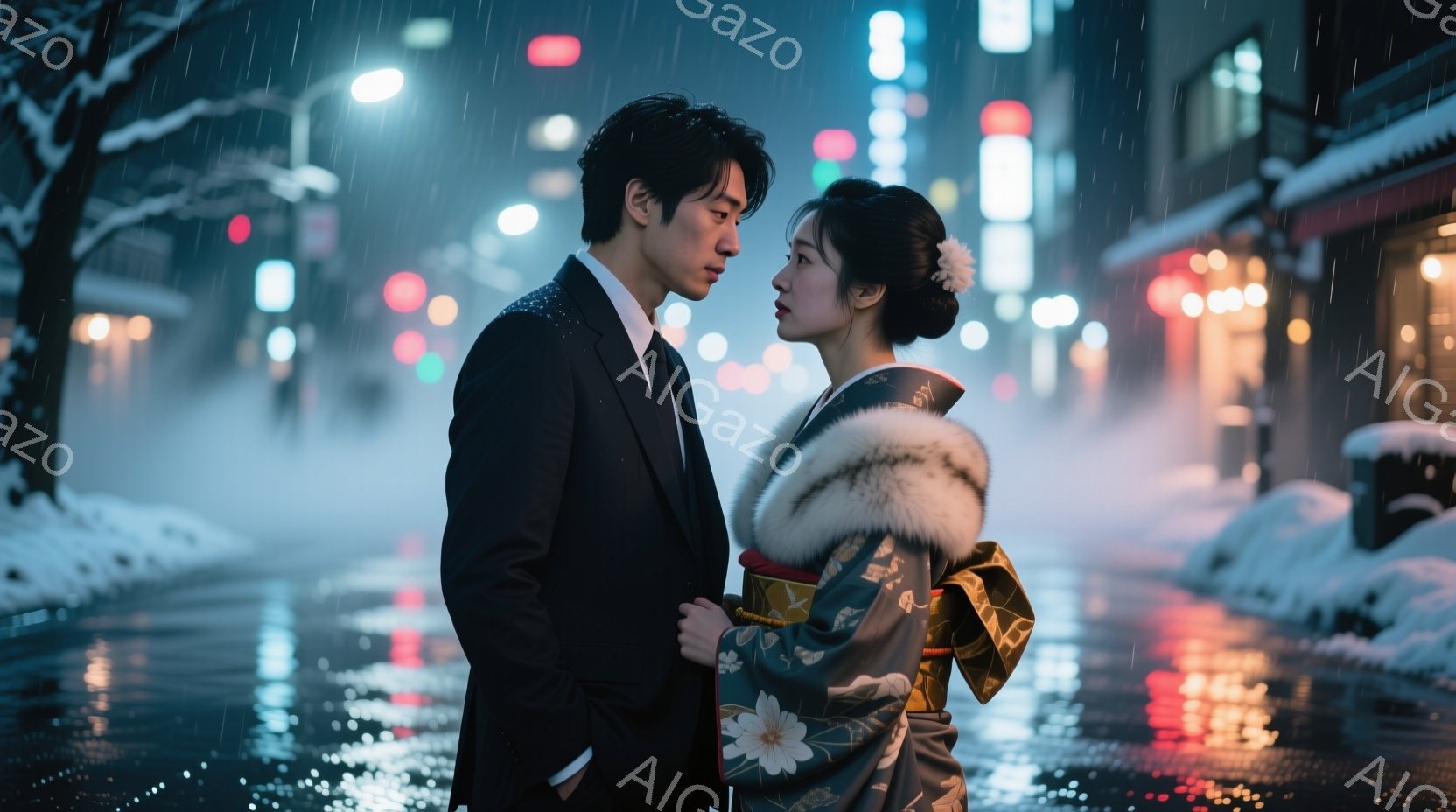 雪が降る夜の街で、一人の男性と女性が向かい合っています。男性は黒いスーツにネクタイ姿で、女性は緑色の花柄の着物と白い襟巻きを身につけ、髪を後ろで結んでいます。二人は寄り添い、何かを語り合っているような、親密な雰囲気です。