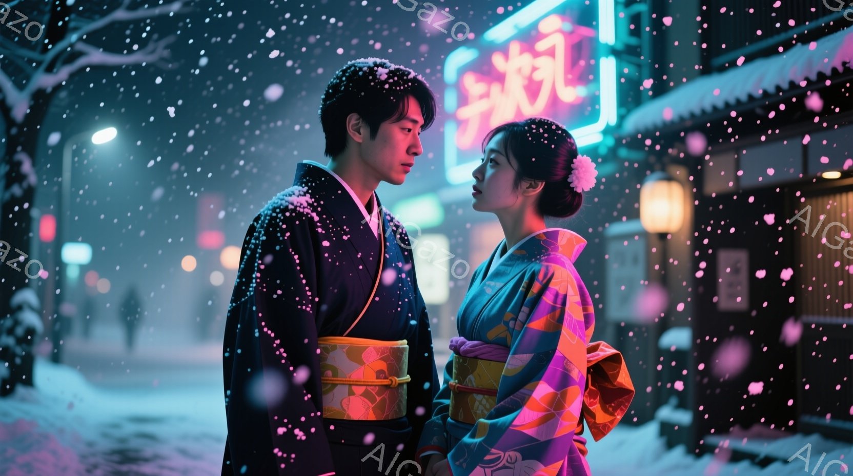 雪が降る古い町並みを、着物姿の男女が手をつないで歩いている。女性は花柄の緑色の着物を着ており、髪を後ろでまとめ、穏やかな表情をしている。男性は黒色の羽織袴を身につけ、女性の方を見て微笑んでいる様子で、全体的に温かく、ロマンチックな雰囲気が漂っている。