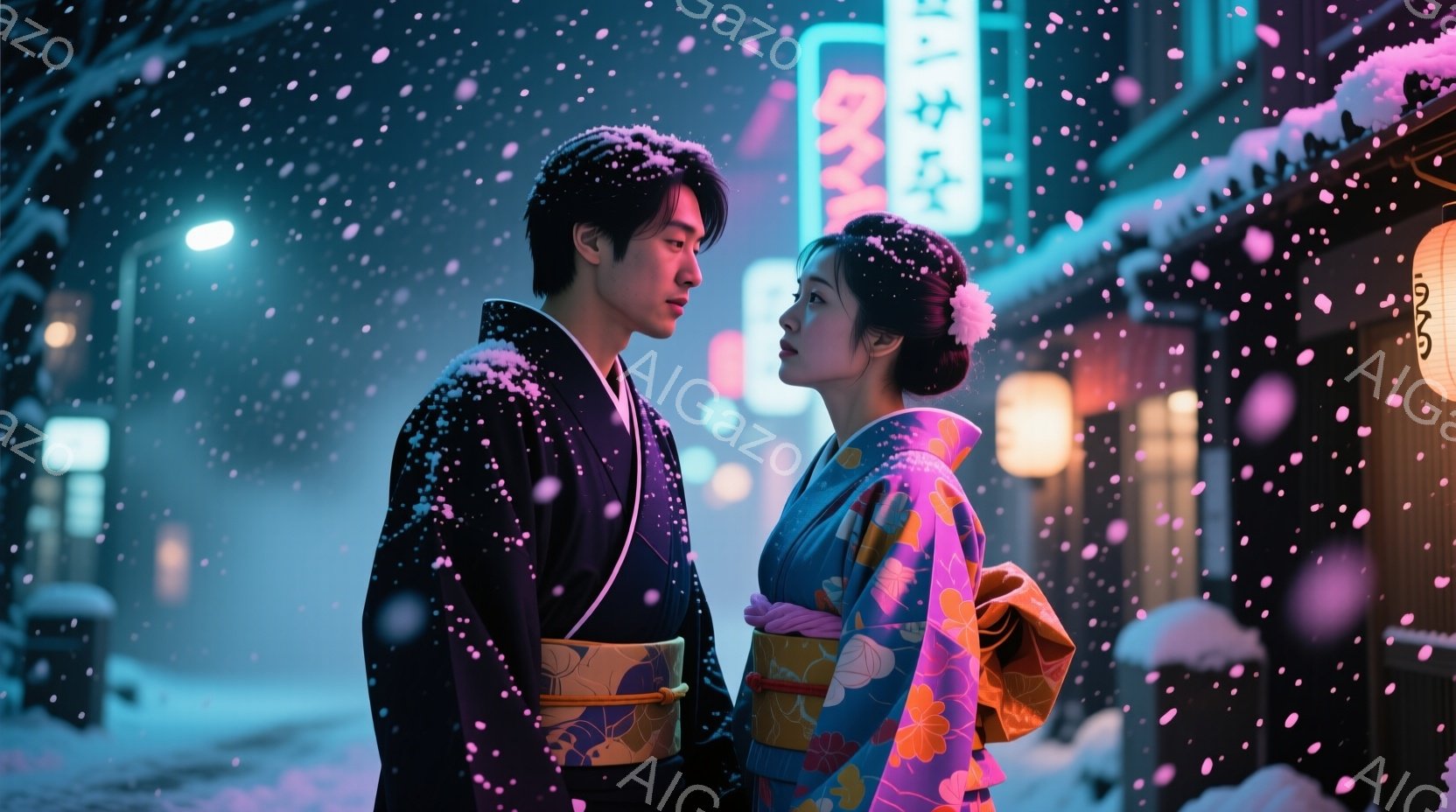 雪が降る夜の街並みで、着物を着た男女が向き合っている。男性は濃い青色の着物を着用し、髪は短く整えられている。女性は花柄の鮮やかな着物を身につけ、髪を高く結い上げ、少し微笑んでいるように見える。