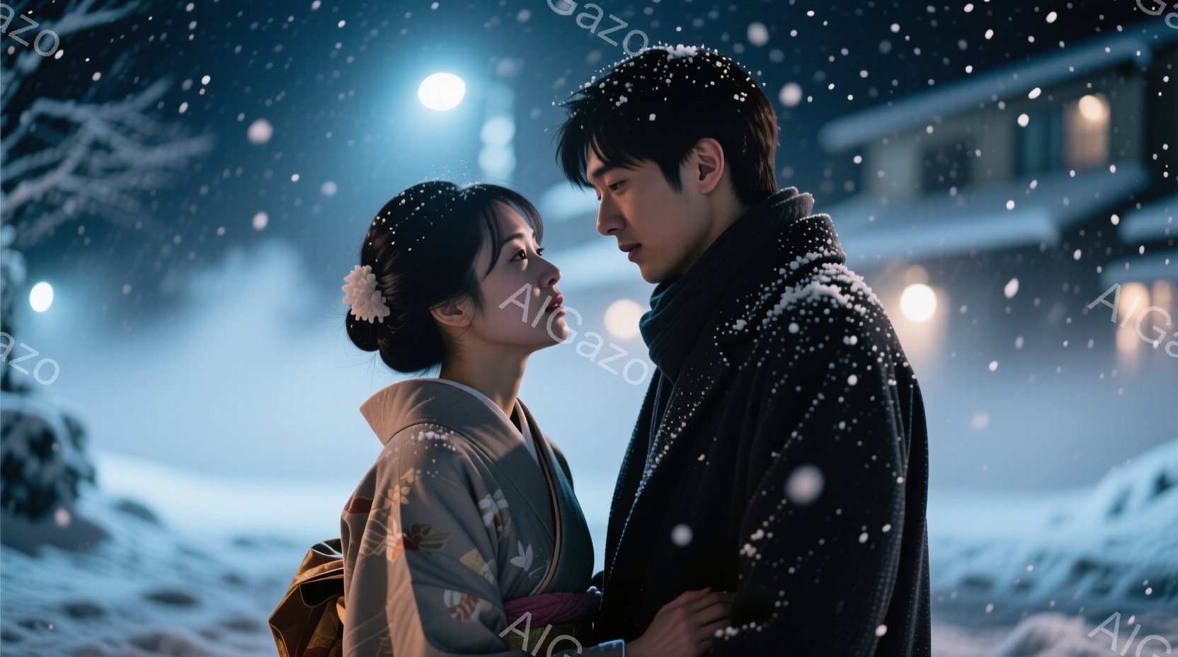 雪が降る中、着物を着た女性とスーツ姿の男性が寄り添って微笑んでいます。女性は花柄の着物と、髪に添えられた白い飾りをつけており、男性は黒いスーツにネクタイを締めています。背景にはライトアップされた建物が見え、ロマンチックで温かい雰囲気が漂っています。