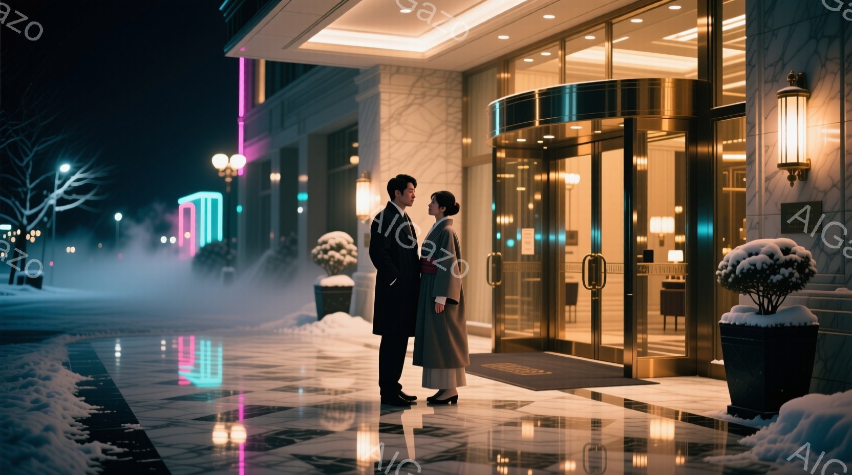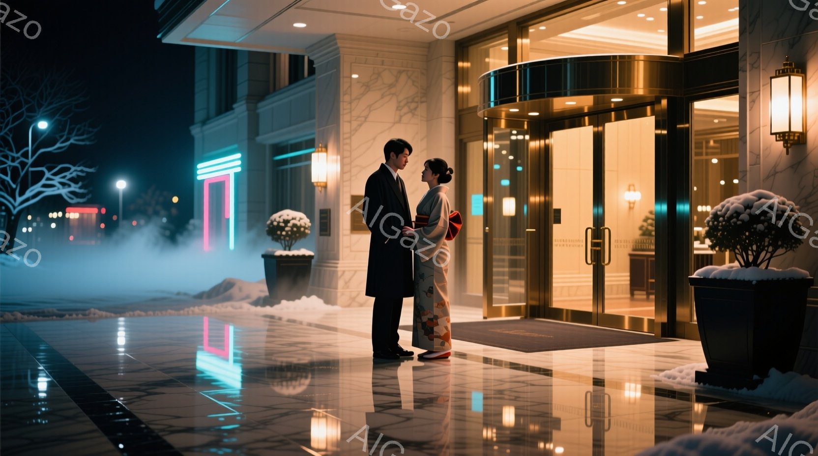 雪が降る夜、男性と女性がホテルの入り口の前で向き合って立っている。女性は鮮やかな赤い着物を着ており、髪は後ろでまとめてエレガントな印象を与えている。背景には光り輝くホテルと雪で覆われた木々が見え、ロマンチックで静謐な雰囲気を醸し出している。