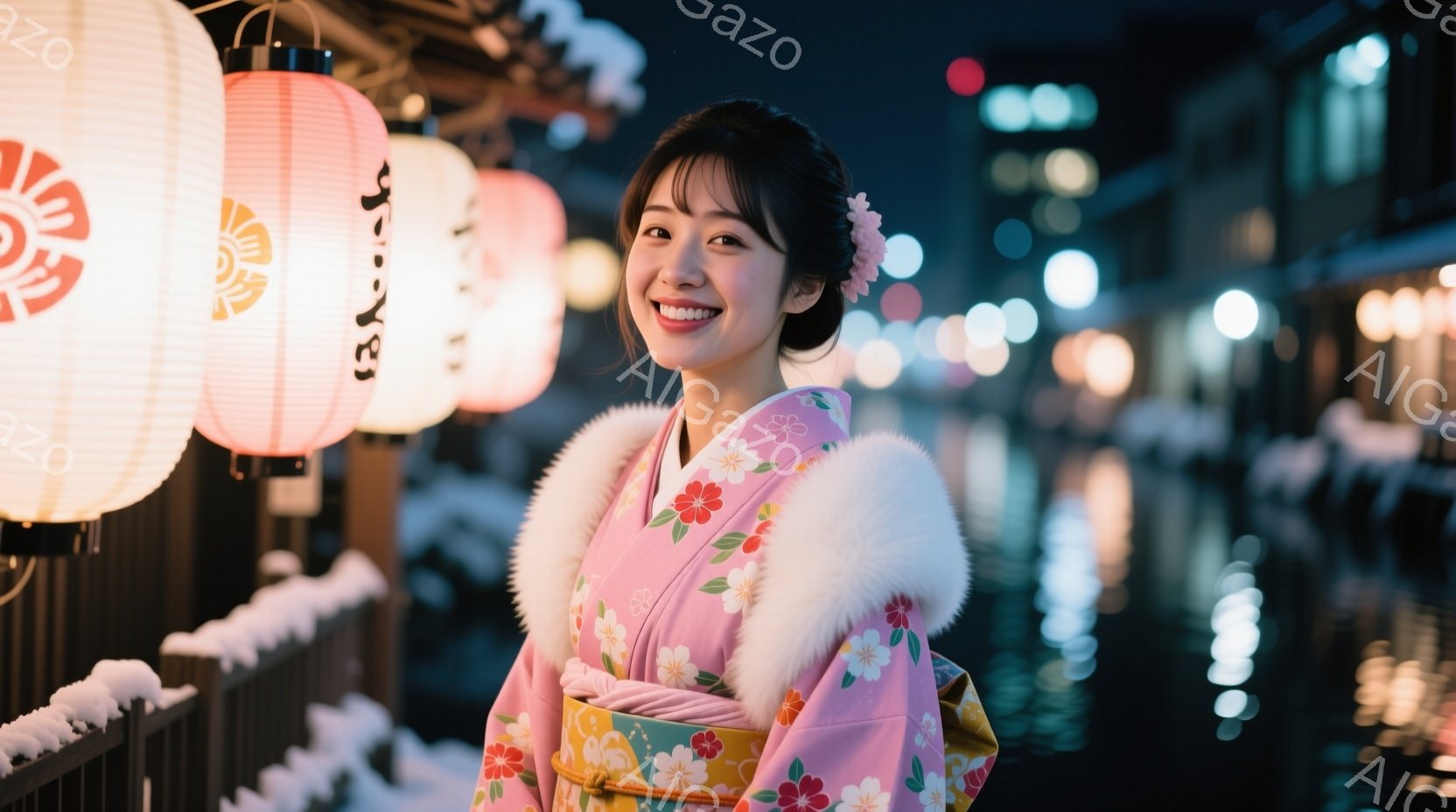 明るいピンク色の着物を着た女性が、笑顔でカメラを見つめています。白いファーの襟元と、黄色と緑の帯が華やかさを添えています。背景には提灯が灯り、雪が舞う夜の街並みがぼんやりと見え、幻想的な雰囲気を醸し出しています。