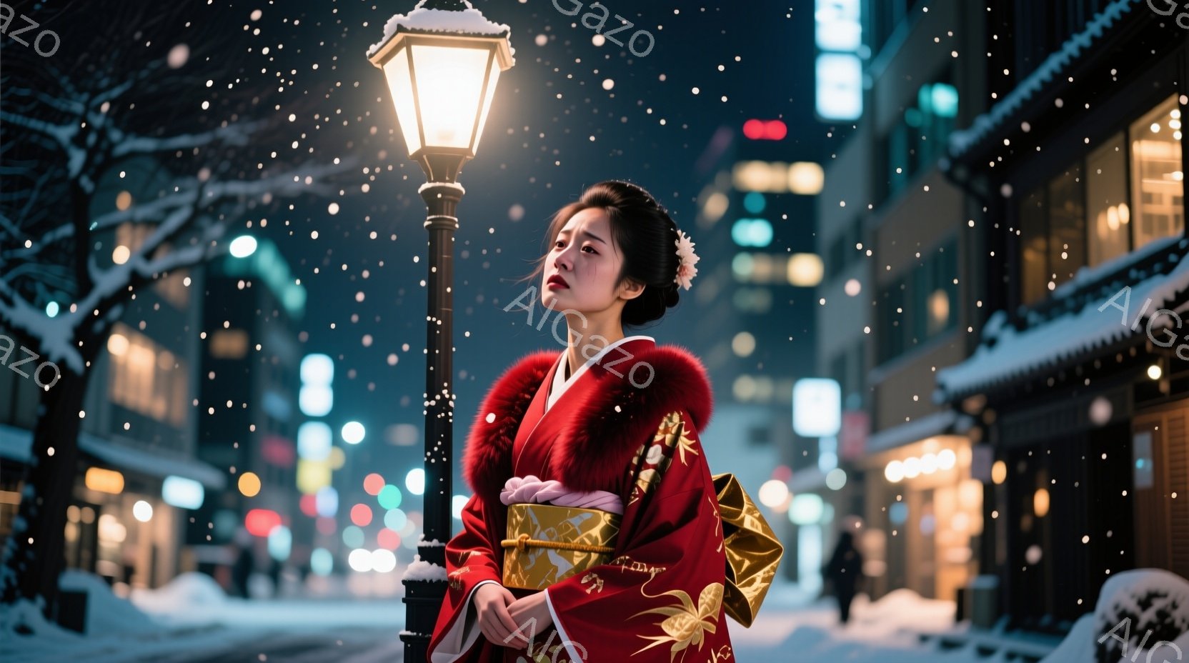 深紅色の着物を身につけた女性が、雪が降る夜の街で佇んでいます。彼女は肩に豪華なファーをあて、髪を丁寧に結い上げており、少し上を見つめる表情はどこか憂いを帯びています。背景には、ぼやけた街灯や商店の明かりが広がり、雪景色が幻想的な雰囲気を醸し出しています。