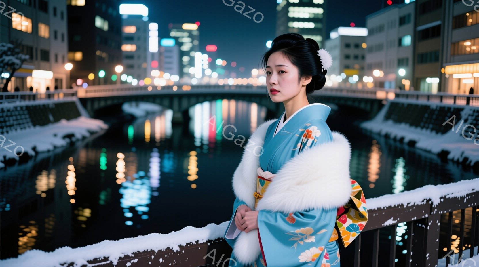 この無料AI生成画像「深紅色の着物を身につけた女性が、雪が降る夜の街で佇んでいます。彼女は肩に豪華なファーをあて、髪を丁寧に結い上げており、少し上を見つめる表情はどこか憂いを帯びています。背景には、ぼやけた街灯や商店の明かりが広がり、雪景色が幻想的な雰囲気を醸し出しています。」は、2025年10月27日に作成されました。 サイズは 1664×928px の高解像度で、商用利用も可能なフリー素材として提供しています。