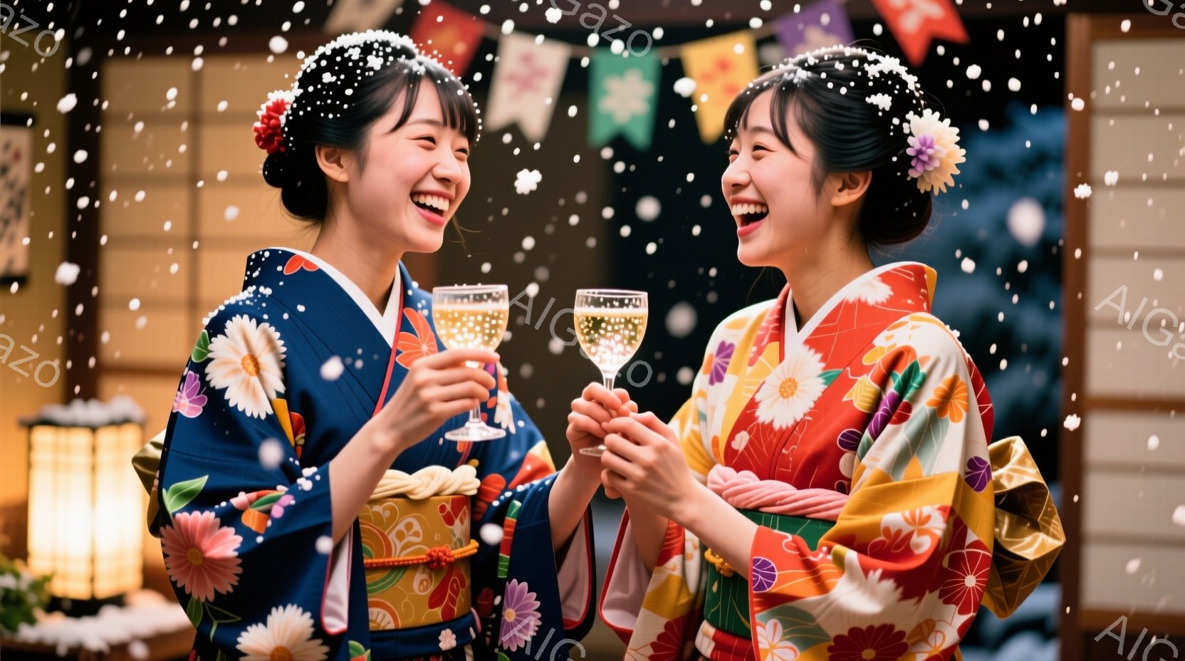 二人の女性が華やかな着物を身に着け、満面の笑みで互いのグラスを合わせようとしています。彼女たちは髪を高くまとめ、花飾りをつけており、背景にはクリスマスツリーと雪が舞う様子が見えます。温かく、お祝いムードに満ちた、冬の特別な瞬間を捉えた写真です。