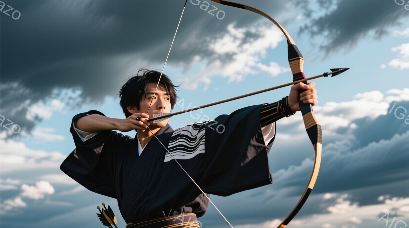 濃い藍色の着物と白い縞模様の帯を身につけた男性が弓を構えています。黒髪を無造作に垂らし、引き締まった表情で集中した様子が伺えます。背景には白く輝く雲が広がり、空は夕焼けのようなオレンジ色と青色のグラデーションを描き、荘厳で力強い雰囲気を醸し出しています。