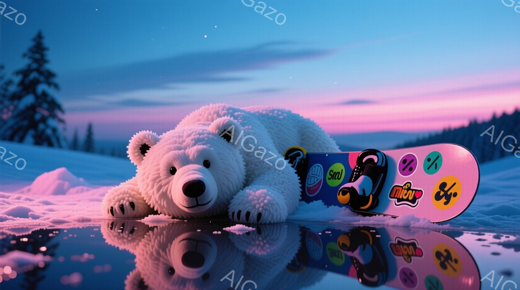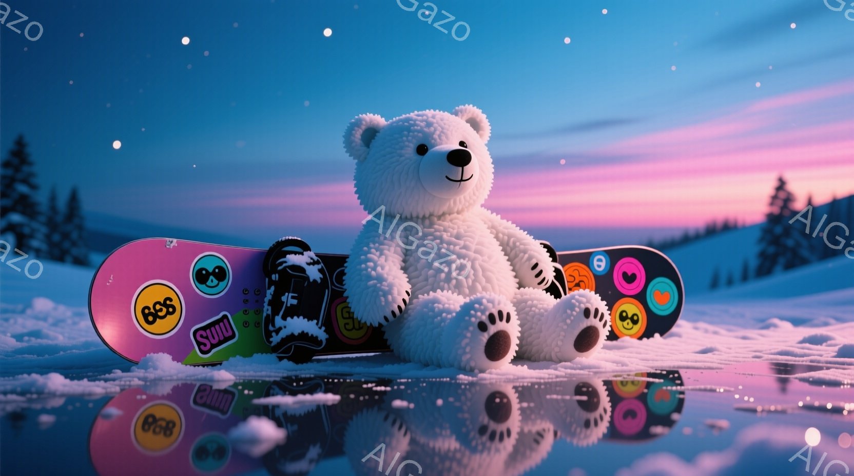 白いテディベアが雪の上に座り、ステッカーが貼られたピンク色のスノーボードにもたれている。背景には雪に覆われた山々と、ピンクと紫の夕焼け空が広がり、冬の穏やかな雰囲気を醸し出している。雪面にはテディベアとスノーボードの反射が映り込み、幻想的な光景を作り出している。