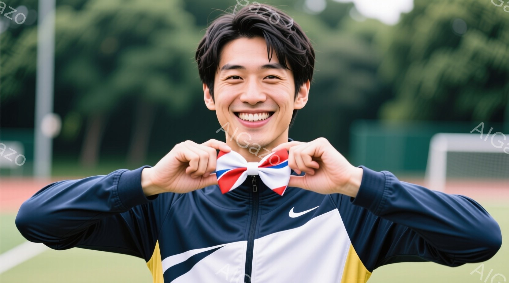この無料AI生成画像「若い男性が、赤い、白い、青いストライプが入ったスカーフを首に巻きながら笑顔でカメラを見ています。彼は白い襟と袖を持つ黒いスポーツウェアを着ており、片腕には白いリストバンドをつけています。背景には緑豊かな木々や芝生があり、晴れた日の屋外で撮影された、明るく元気な雰囲気の画像です。」は、2025年10月22日に作成されました。 サイズは 1664×928px の高解像度で、商用利用も可能なフリー素材として提供しています。