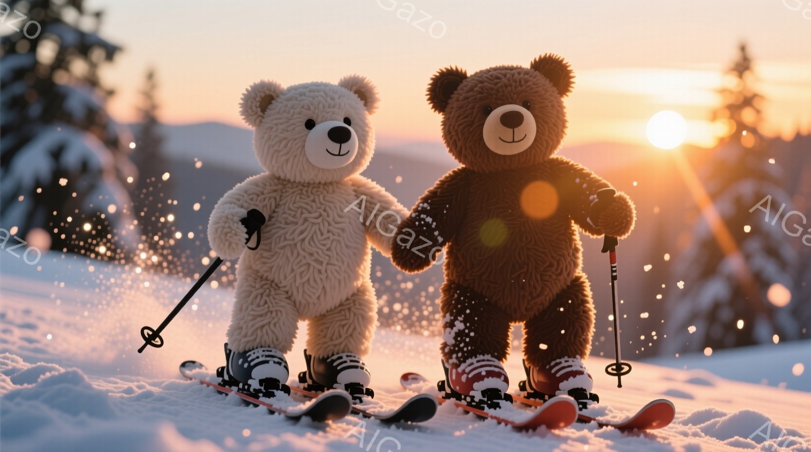 雪の上でスキーをする2匹のテディベアが描かれています。一方のベアは茶色で、もう一方のベアは白く、それぞれスキー板とスキーポールを持ち、楽しそうに前を見据えています。背景には雪景色と夕焼けが広がり、温かく幻想的な雰囲気が漂っています。