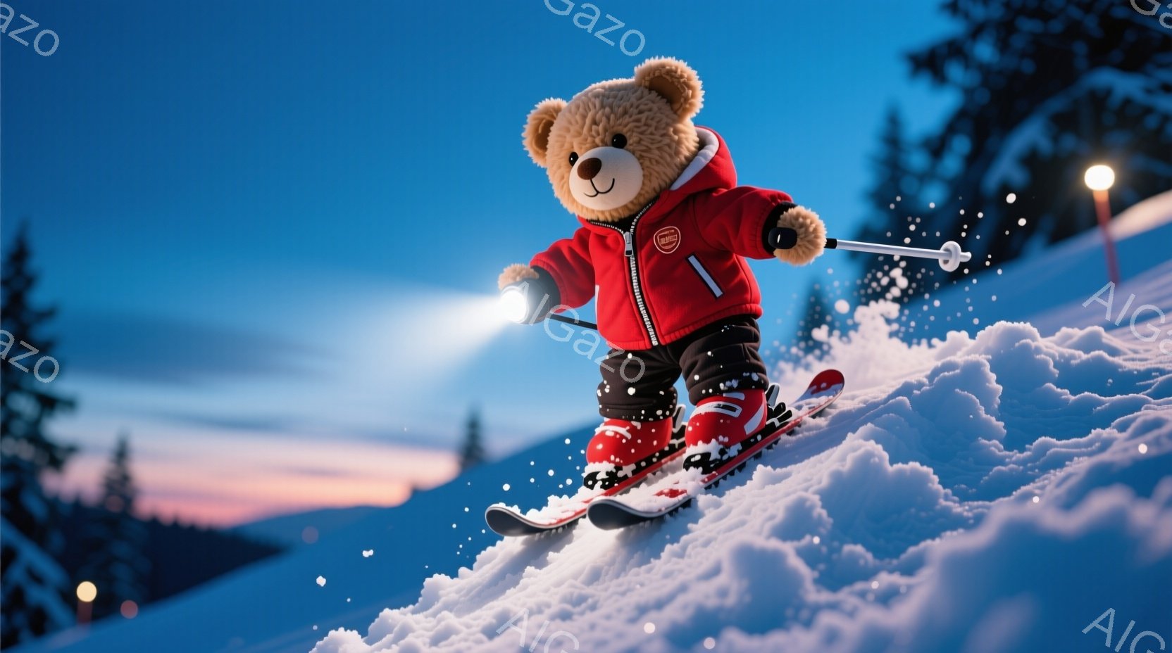 赤いスキーウェアを着たテディベアが雪山をスキーで滑っている様子が描かれています。雪は飛び散り、スピード感があり、背景には暗い緑色の針葉樹林と夕焼け空が広がっています。全体的に、夜のスキーを楽しむ、暖かく、活気に満ちた雰囲気です。