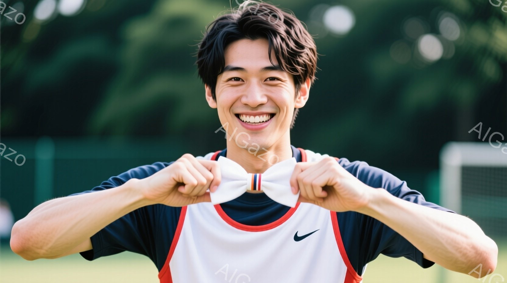 この無料AI生成画像「この男性は、紺色の襟付きスポーツウェアに、英国旗の模様をしたリボンを首に結んでいます。彼は笑顔でカメラに向かっており、両腕を少し曲げてリボンを指しています。背景には緑の芝生とサッカーゴール、そして木々が見え、晴れた日の屋外で撮影されたようです。」は、2025年10月22日に作成されました。 サイズは 1664×928px の高解像度で、商用利用も可能なフリー素材として提供しています。