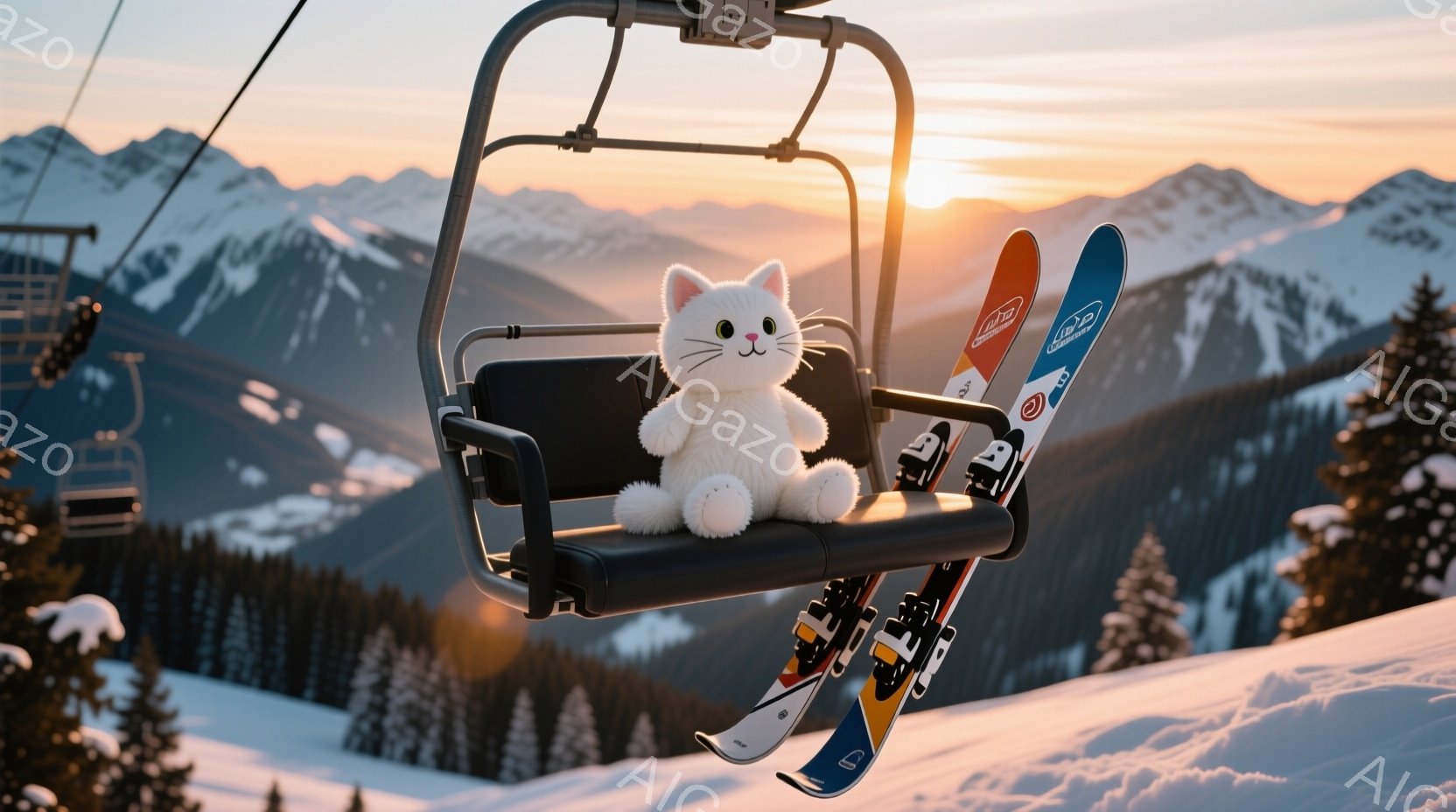 白いぬいぐるみ猫がスキーリフトの椅子に座っており、足元には赤いスキー板が立てかけてあります。背景には雪を頂いた山々が広がり、夕焼けのようなオレンジ色の空が美しい景色を作り出しています。全体的に穏やかで可愛らしい雰囲気で、冬のスキー場を象徴する光景です。