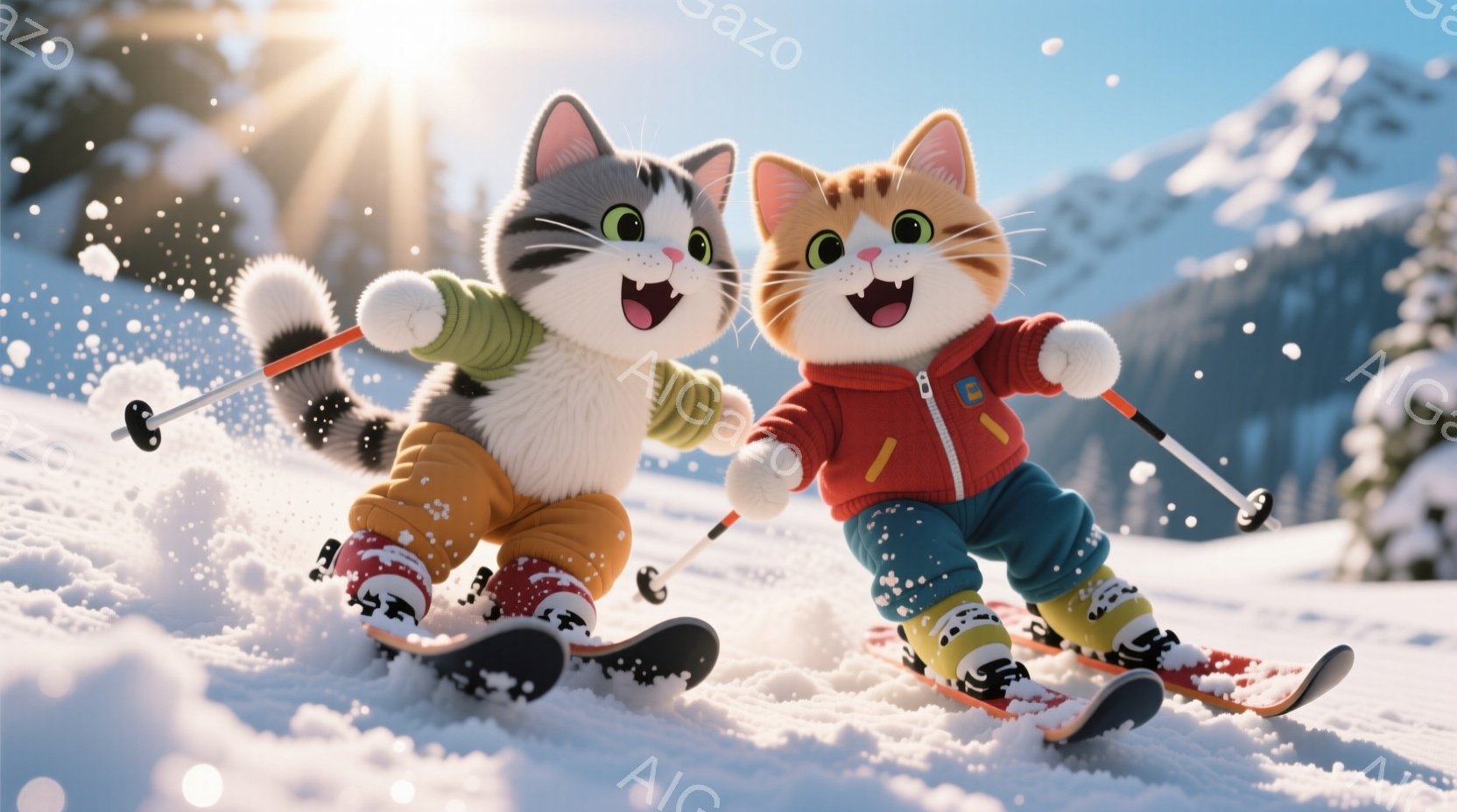 白い雪の上を滑っている二匹の猫が描かれています。縞模様の猫とオレンジ色の猫は、スキー板を履き、スキーポールを持って楽しそうに笑っており、躍動感に満ちています。背景には雪をまとった木々や山々が広がり、晴天のもと、冬の活気あふれる雰囲気が表現されています。