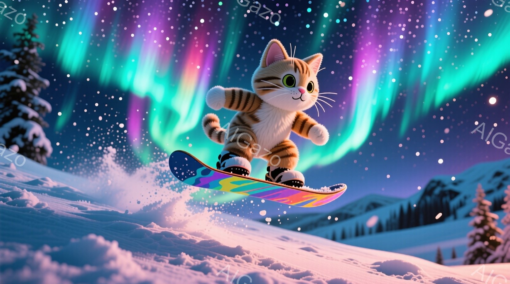 オレンジ色の縞模様の猫が、雪の上をスノーボードに乗って滑っている様子が描かれています。背景には、緑とピンクのオーロラが広がり、雪に覆われた山々と暗い森が広がっています。全体的に、幻想的で遊び心のある冬の雰囲気が漂っています。