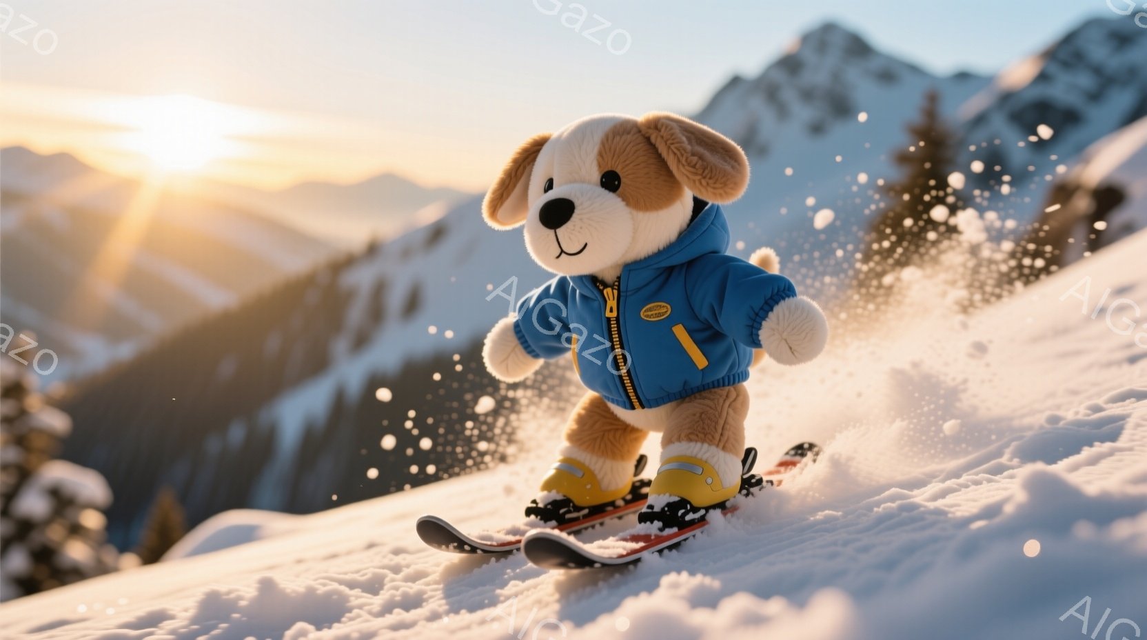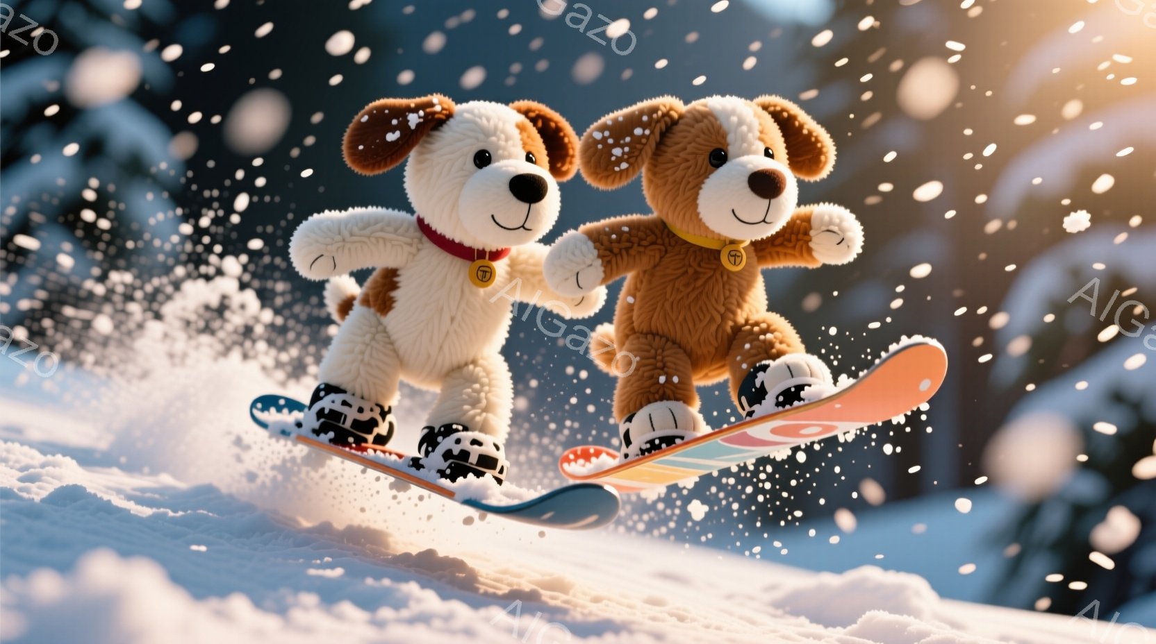 ふわふわの茶色い犬が2匹、スキー板に乗って雪山を滑走している様子が描かれています。それぞれ赤いバンダナを頭に巻き、首輪には金色のタグが付いています。背景は白い雪に覆われた山で、雪が舞い、明るく楽しい雰囲気が漂っています。