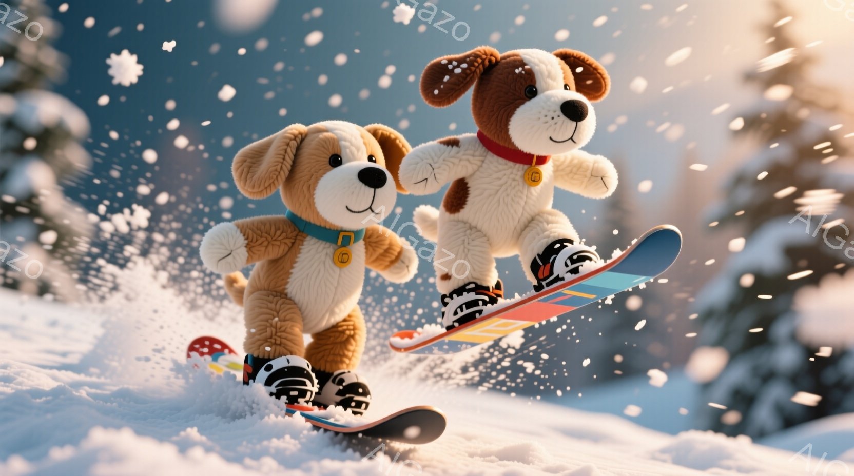 ふわふわの茶色と白の犬のぬいぐるみ二匹が、雪の上をスノーボードで滑走している。彼らは赤いスノーボードに乗り、楽しそうな表情で前進しており、冬の雪景色の中、躍動感に満ちた様子が表現されている。背景は白い雪景色で、雪が舞っており、冬の活気と楽しさを感じさせる。