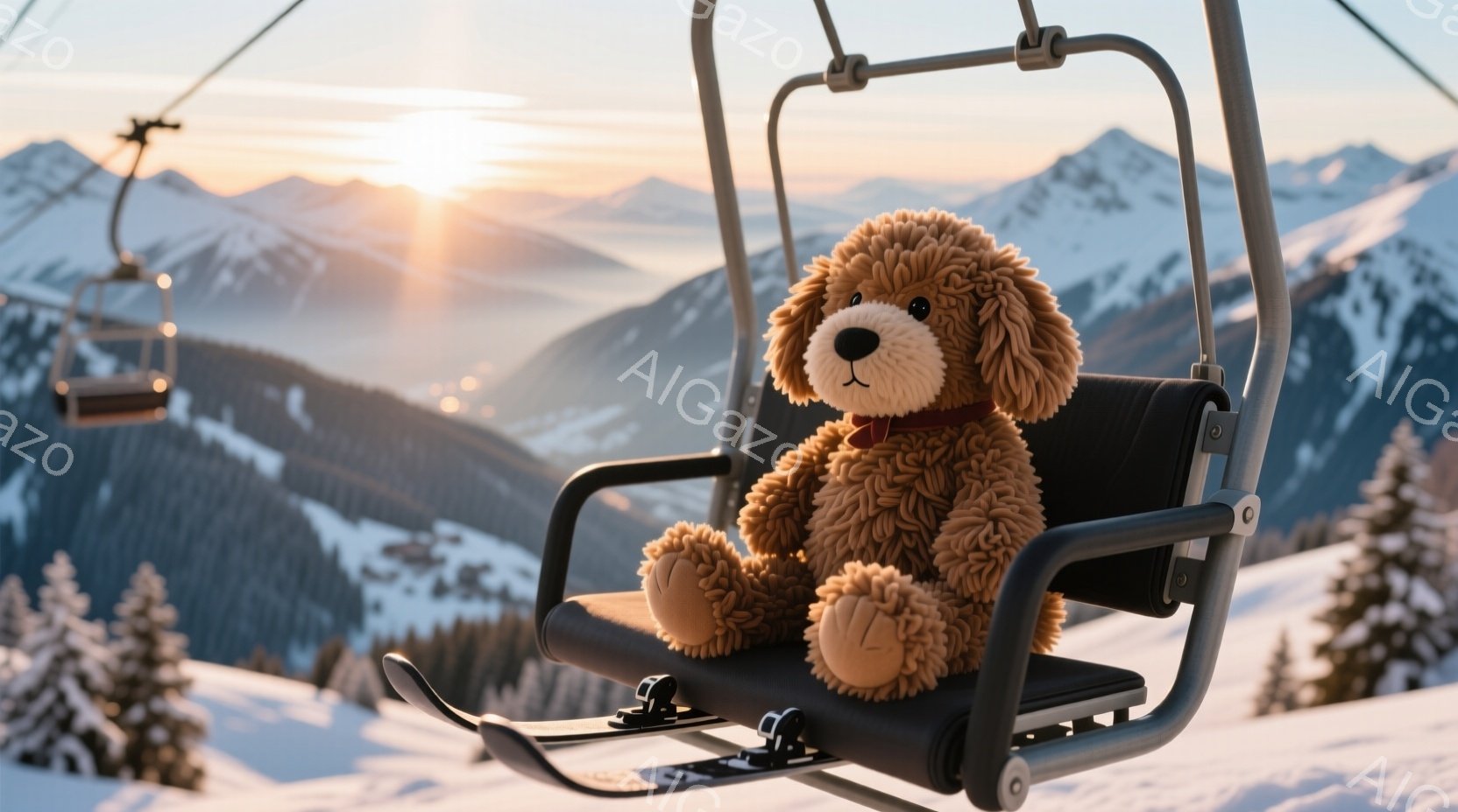 ふわふわの茶色の犬のぬいぐるみは、スキーリフトの椅子に座っており、小さなスキー板が足元に固定されています。背景には雪を頂いた山々が連なり、夕焼けのような暖かな光が全体を包み込んでいます。この光景は、冬の穏やかで遊び心のある雰囲気を醸し出しています。