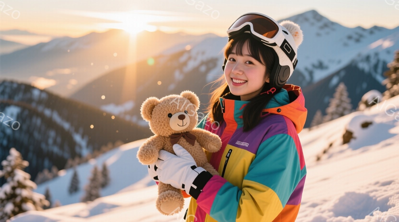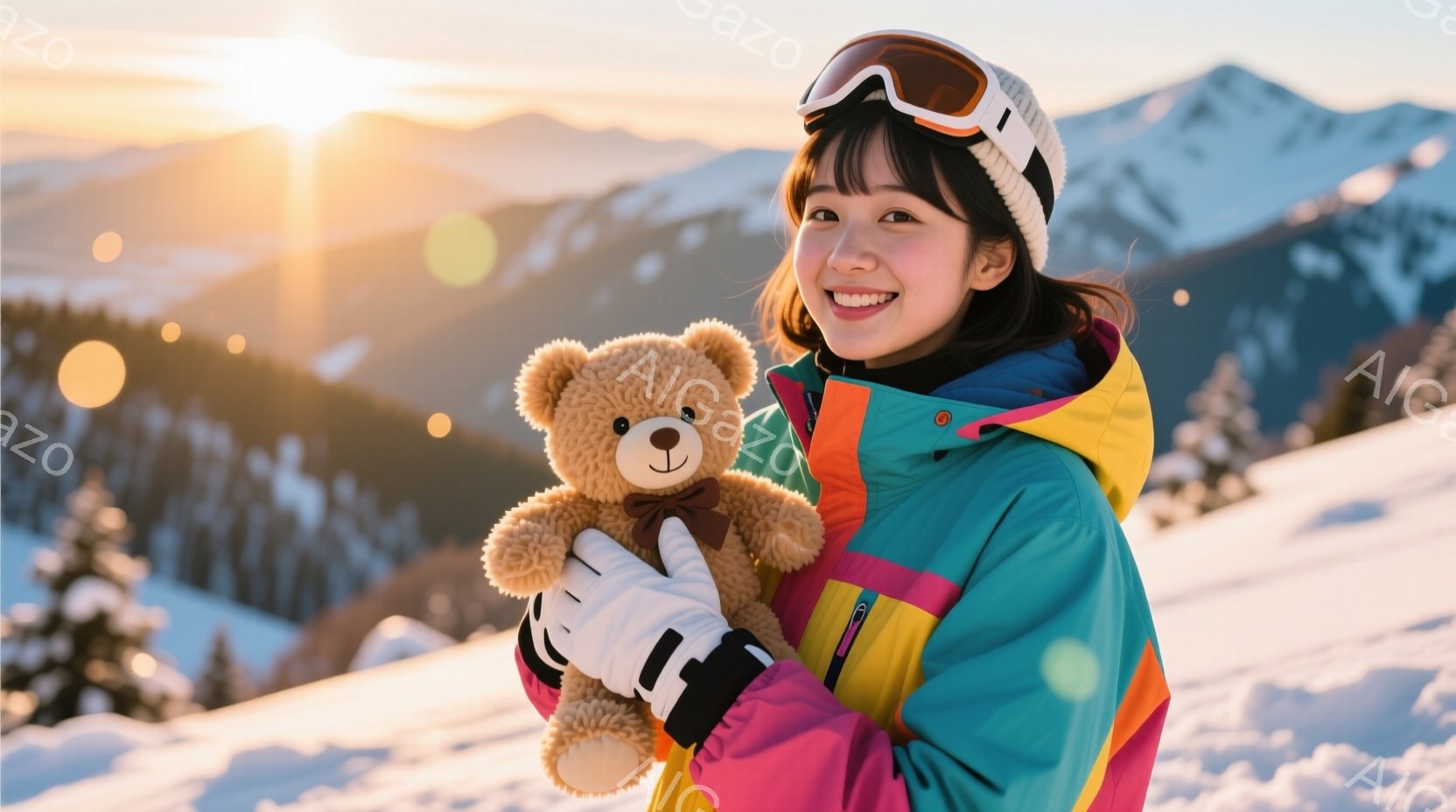 雪山を背景に、カラフルなスキーウェアを着た若い女性が、テディベアを抱えています。彼女は、ピンク色の内張りのフード付きジャケットと白のゴーグルを身に着け、満面の笑みを浮かべています。背景には雪に覆われた山々が広がり、夕焼けのような暖かい光が差し込んでいます。