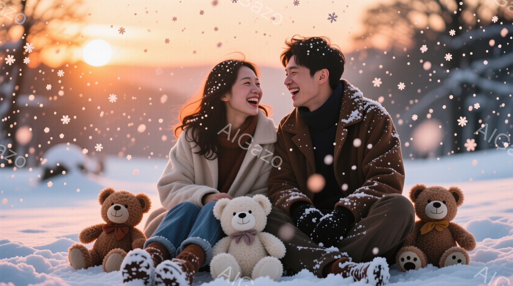 雪景色の中、若い男女が寄り添って座り、満面の笑みを浮かべている。女性はベージュのコートに赤いマフラー、男性は黒のジャケットに薄いピンクのセーターを着ており、それぞれ片側にテディベアが置かれている。背景には雪に覆われた木々が広がり、夕焼けの光が柔らかく差し込み、温かく幸せな雰囲気を醸し出している。