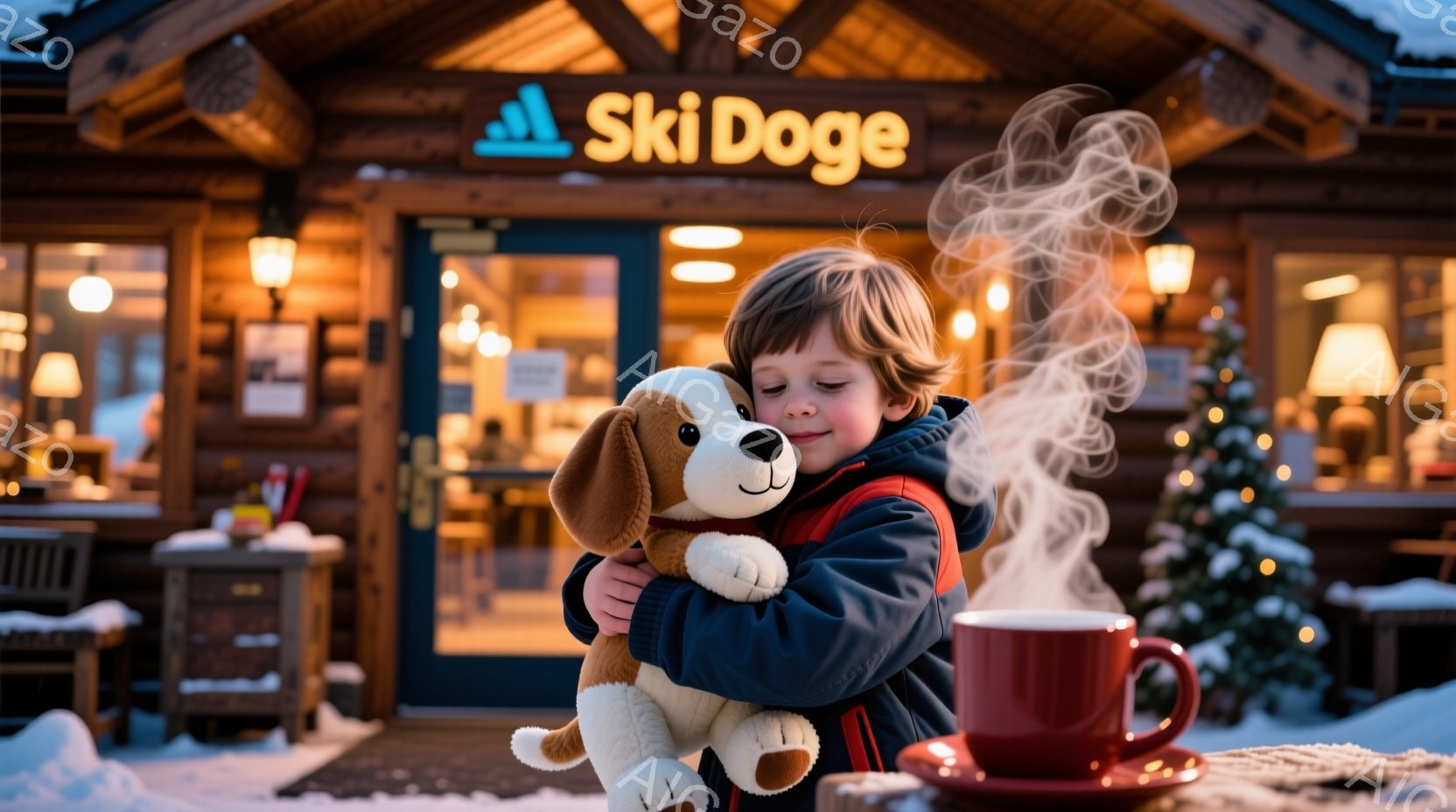 小さな少年が、ふわふわの茶色の犬のぬいぐるみを抱きしめています。少年は濃い青色のジャケットを着ており、金髪の髪が少し乱れています。背景には木造の建物が見え、暖炉の光が温かい雰囲気を醸し出しており、雪が降り積もった冬の景色が広がっています。