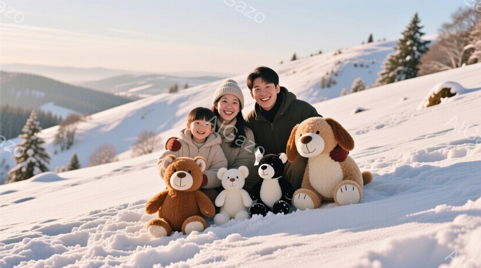 雪景色の中で、家族が可愛らしいテディベアと一緒に写っています。父親は茶色のジャケット、母親は白いニット帽をかぶり、子どもは同じくニット帽とダウンジャケットを着て、皆笑顔でカメラを見ています。背景には雪に覆われた丘と木々が広がり、穏やかで温かい雰囲気が漂っています。