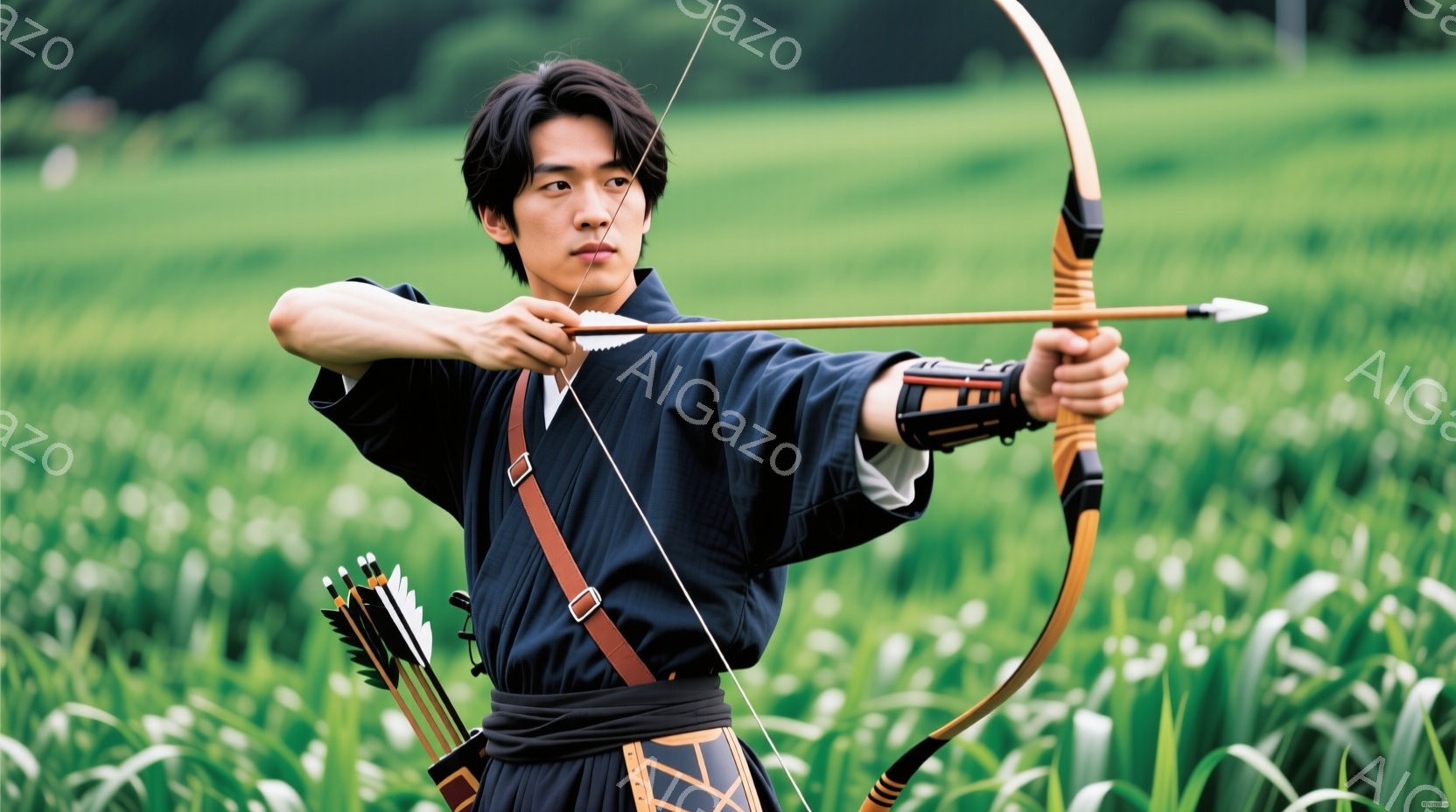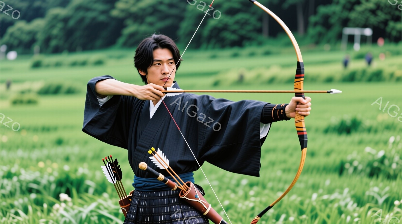 濃い緑色の草むらの中に、弓を持つ男性が描かれている。黒い着物を着ており、髪は後ろで束ねられている。彼の表情は真剣で、弓を引くための準備をしている様子がうかがえる。
