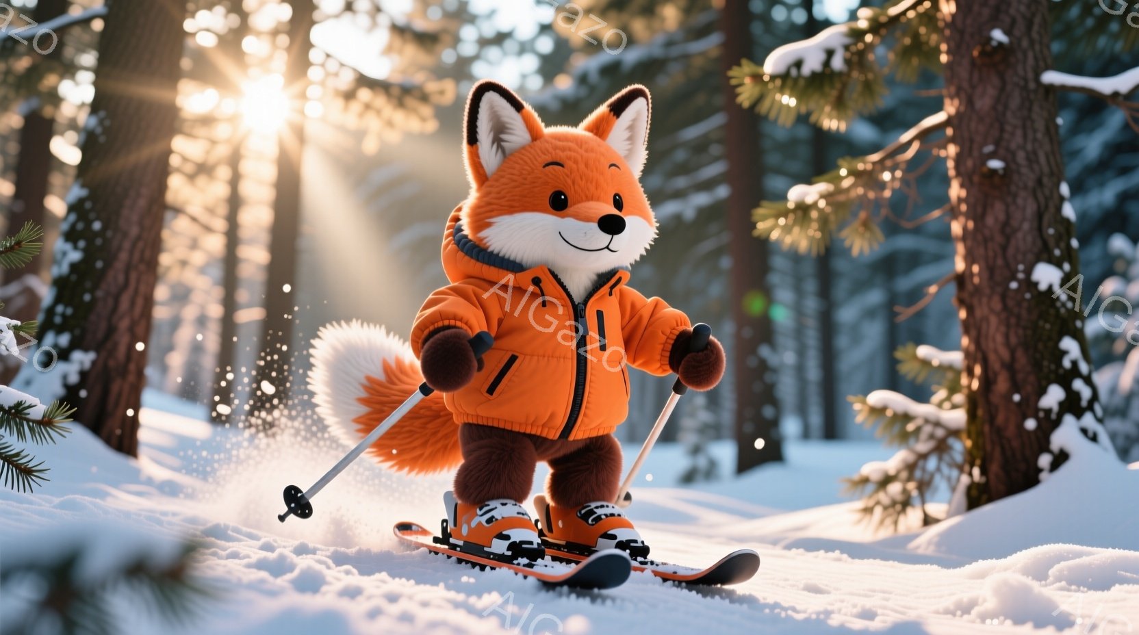 オレンジ色のスキーウェアを着たキツネが、雪の上をスキースティックを持って立っています。背景には雪に覆われた木々が立ち並び、雪が舞う冬の森の様子が描かれています。全体的に温かみのある雰囲気で、可愛らしいキツネが冬の景色の中で楽しんでいる様子が伝わってきます。
